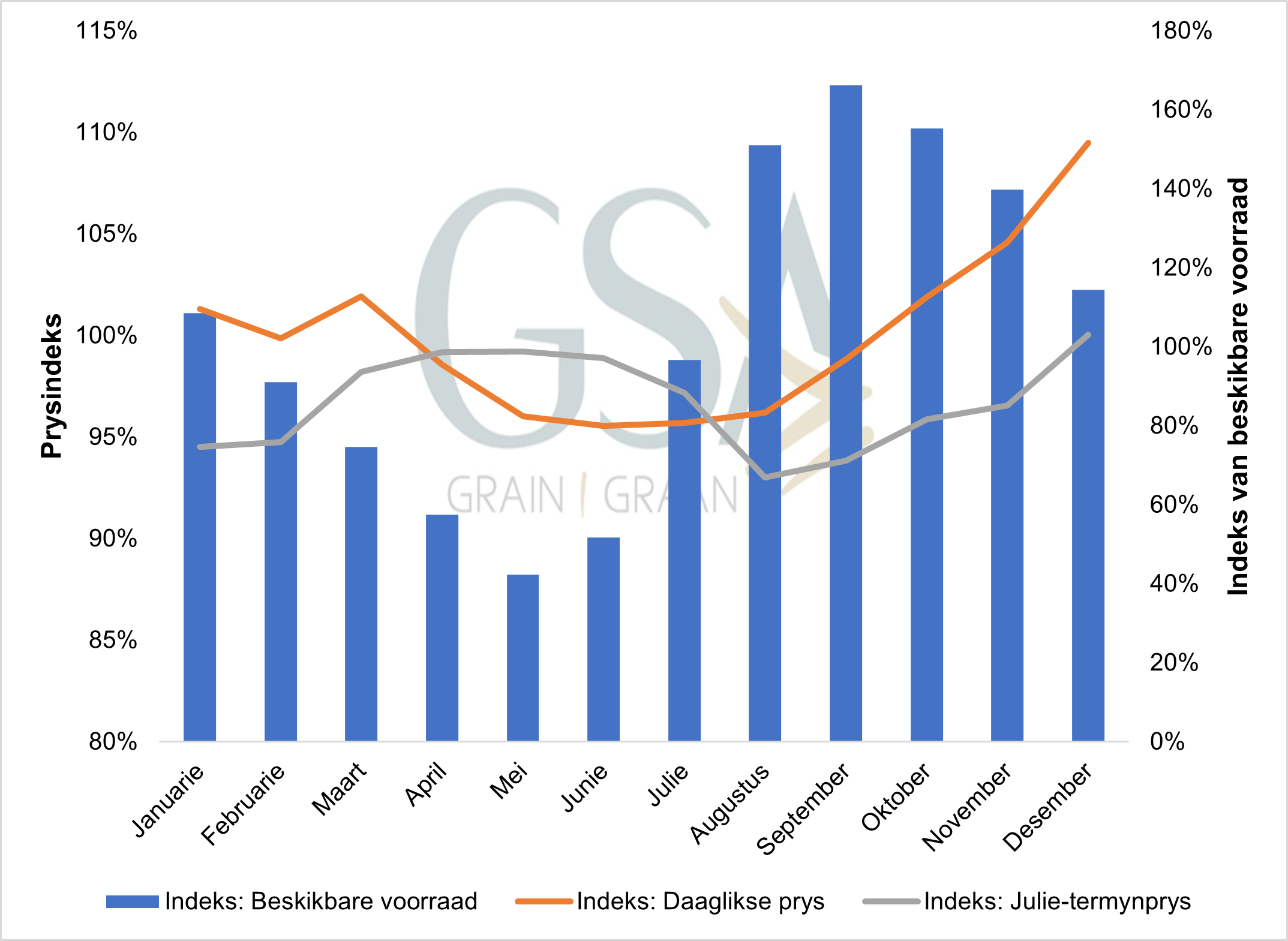 Aan die begin van die jaar (Januarie) het die indeks vir beskikbare witmielievoorraad op 109% gestaan, terwyl die daaglikse prysgemiddeld 101% was en die Julie-termynkontrakindeks 95%. Die indekstendense dui daarop dat pryse relatief naby aan die langtermynprys verhandel, met die meeste maande wat bo dié gemiddeld verhandel. Voorraadvlakke daal vinnig soos wat die seisoen vorder en teen Mei bereik dit ’n laagtepunt van slegs 42% van die jaarlikse gemiddeld.