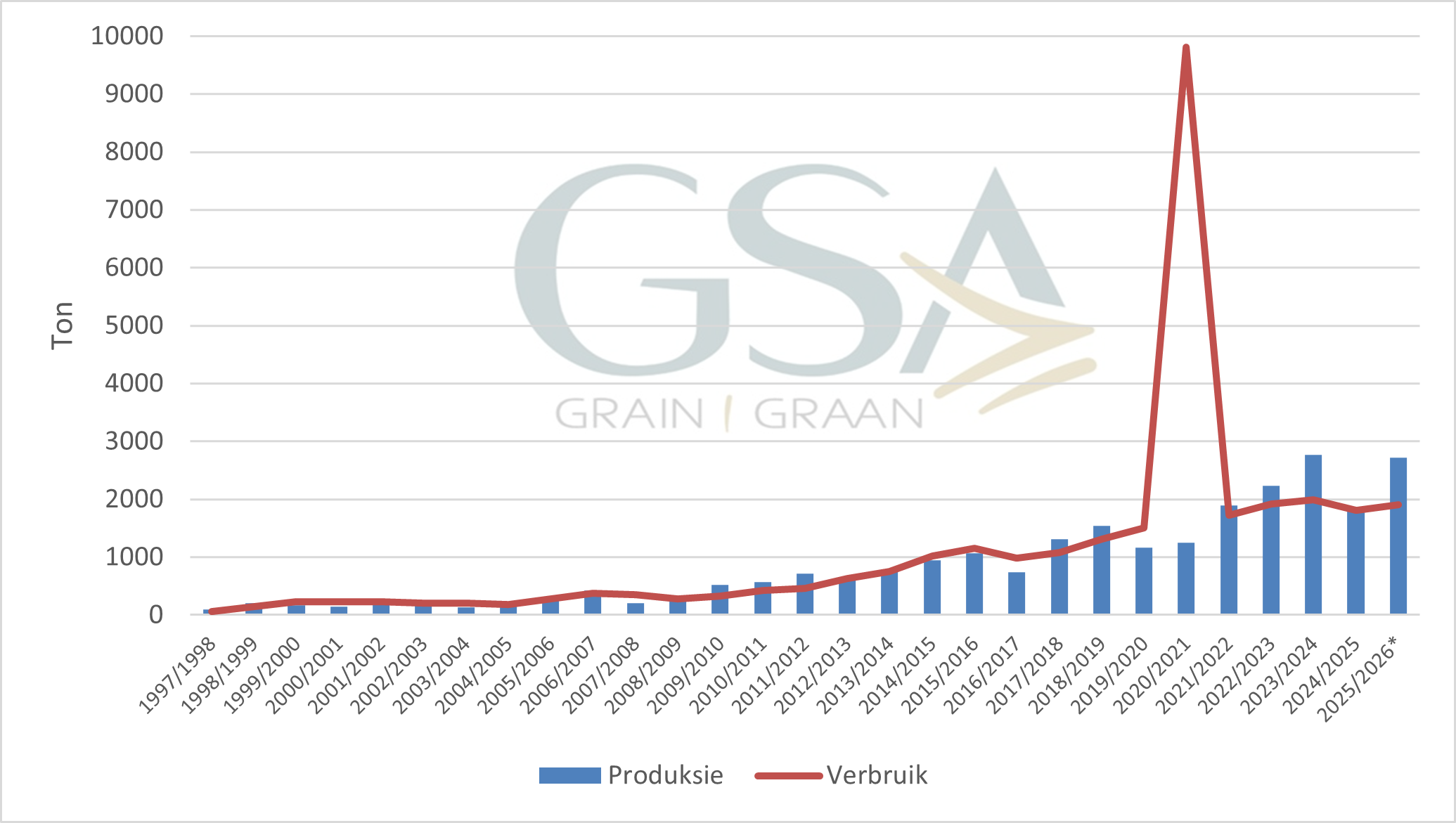 Die Suid-Afrikaanse sojaboonmark het in groot mate eers sedert 2012 tot sy reg begin kom. Suid-Afrika was tradisioneel nie ’n groot sojaboonprodusent nie en het gemiddeld minder as 100 000 ton per jaar geproduseer. Nie net was die produksie laag nie, die verwerkingskapasiteit was ook minimaal. Die plaaslik geproduseerde sojabone is altyd uitgevoer – net sodat sojaboonoliekoek, wat as proteïenbron in veevoer gebruik word, weer ingevoer kon word. Aangesien daar plaaslik ’n goeie vraag na sojaboonolie en -oliekoek is, is baie geleenthede vir uitbreiding in die plaaslike sojaboonmark geskep. Sedert die 2012-seisoen is daar begin om hierdie geleenthede te ontsluit en die plaaslike sojaboonmark het sedertdien sterk gegroei, beide in terme van produksie en verbruik. Grafiek 1 toon die plaaslike sojaboonproduksie en -verbruik sedert die 2000/2001-seisoen.