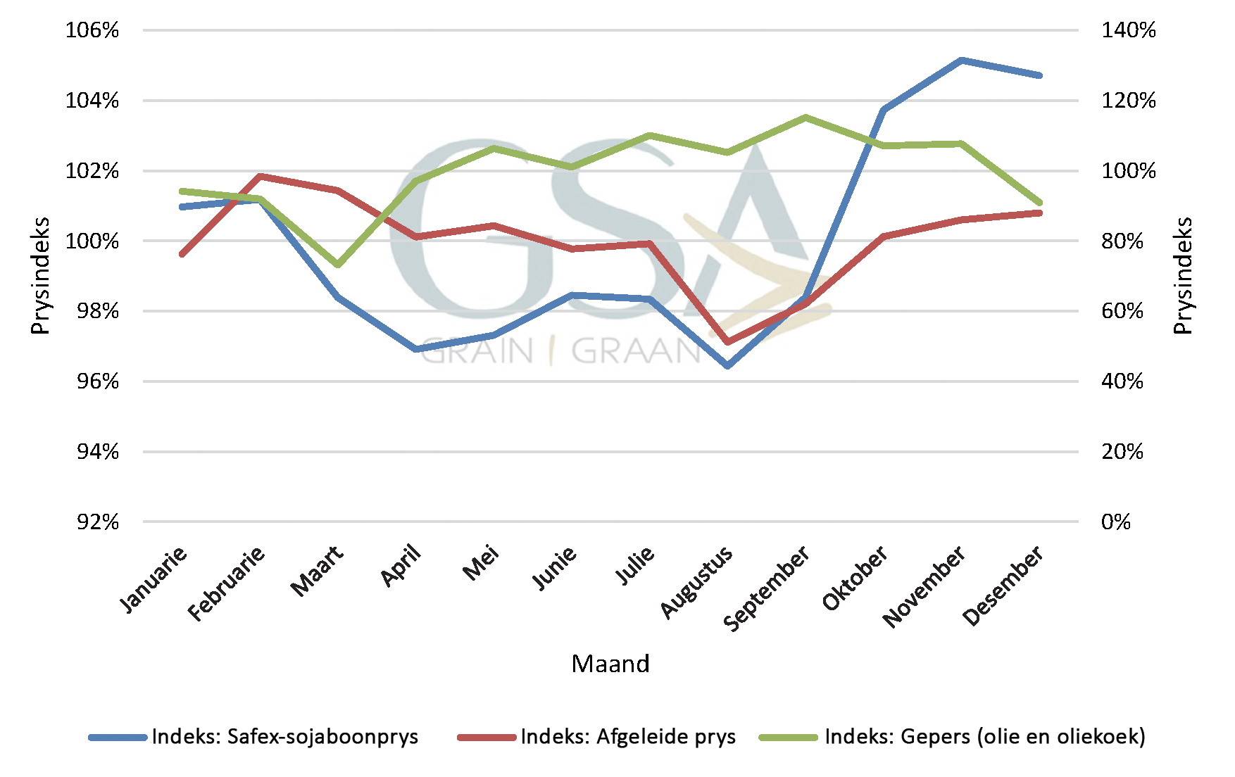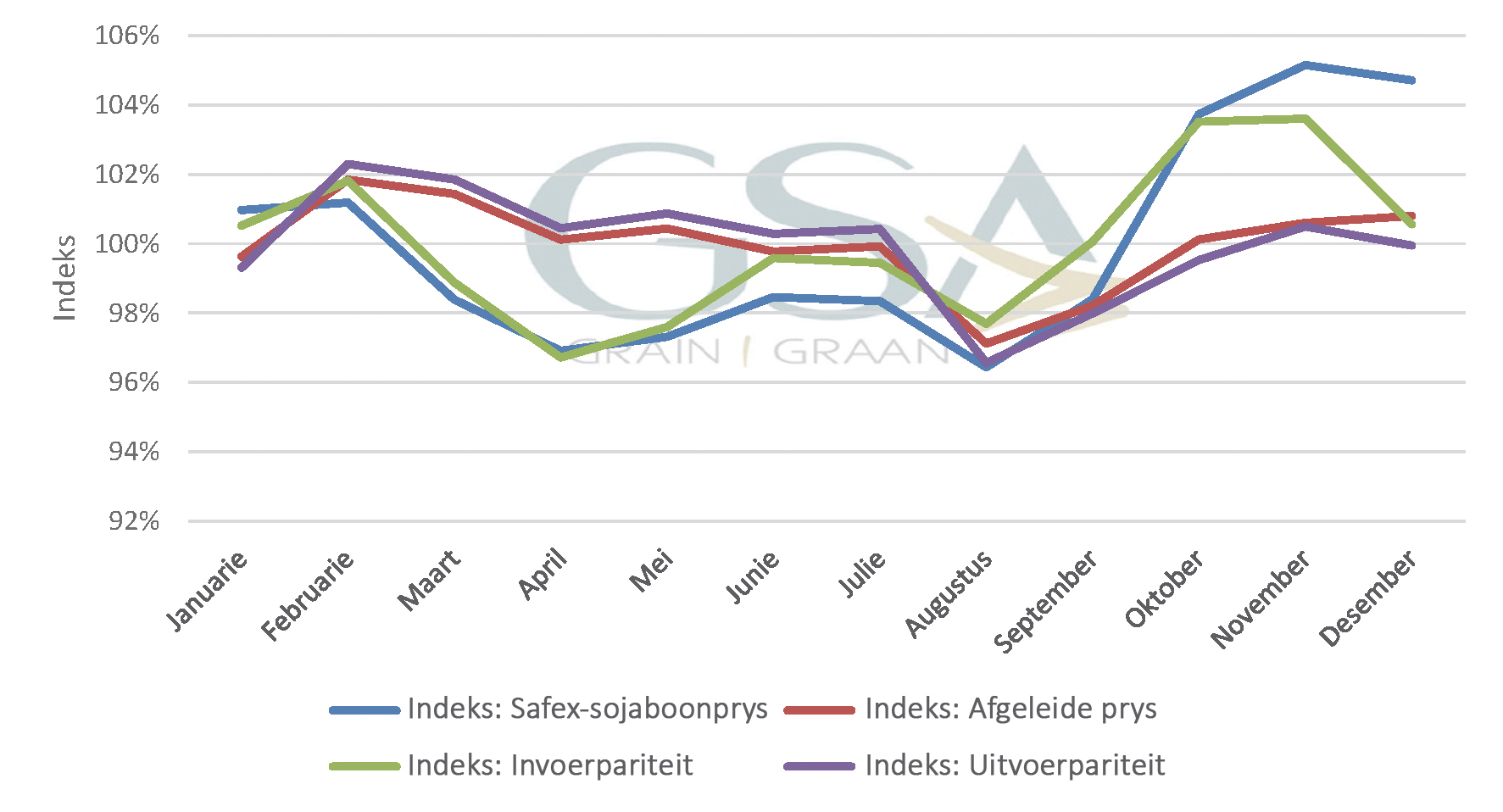 Grafiek 2 toon die seisoenale indekse van die Safex-sojaboonpryse, invoer- en uitvoerpariteitspryse asook die afgeleide pryse. Dit is duidelik uit Grafiek 2 dat die plaaslike sojaboonprys oor die algemeen die hoogste is tydens Desember en Januarie wanneer dit 5% bo die jaarlikse gemiddeld verhandel. Die prys is oor die algemeen die laagste tydens April wanneer dit gemiddeld 6% laer as die jaarlikse gemiddelde prys verhandel. Die meeste sojabone word in April en Mei gestroop, wat plaaslike pryse onder druk plaas. In terme van die pariteitspryse kan gesien word dat dit oor die algemeen die hoogste is tydens Junie, waar dit gemiddeld tussen 4% en 5% bo die gemiddelde jaarlikse pryse verhandel. Dit is hoofsaaklik die feit dat dit planttyd in Amerika is wat die internasionale pryse gedurende hierdie tydperk ondersteun.