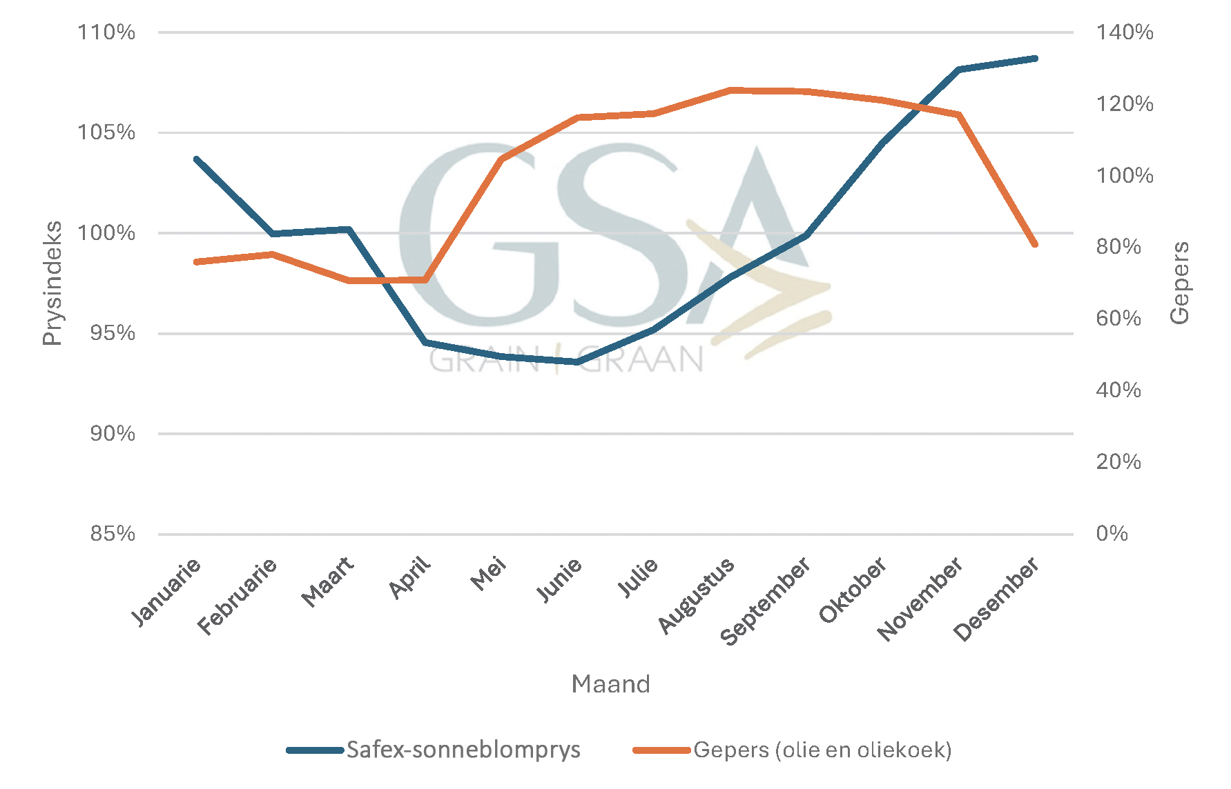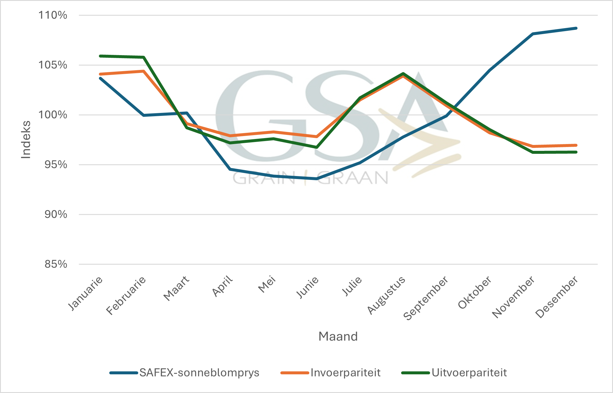 In die plaaslike sonneblomsaadmark beïnvloed verskeie faktore die prysdinamika. Omdat sonneblom deel vorm van die breër oliesaadkompleks, speel internasionale en plaaslike olie- en oliekoekpryse ’n sleutelrol in prysvorming. Anders as by mielies en koring, waar pariteitspryse die grootste drywers is, is die prysreaksie in die oliesaadkompleks meer gedemp omdat olie en oliekoek apart ingevoer kan word. Volgens die seisoenale-indekswaardes in Grafiek 2 is Safex-sonneblompryse gewoonlik die hoogste tussen November en Januarie (108 tot 109% van die jaarlikse gemiddeld), terwyl pryse die laagste in April en Mei is (94 tot 95%), hoofsaaklik as gevolg van die strooptyd wat plaaslike pryse onder druk plaas. Die invoer- en uitvoerpariteitspryse toon ’n soortgelyke seisoenale patroon, maar met minder duidelike skommelinge. Hierdie bewegings bevestig dat die mark in ’n groot mate volgens klassieke aanbod-en-vraag-dinamika funksioneer, veral rondom oestyd.