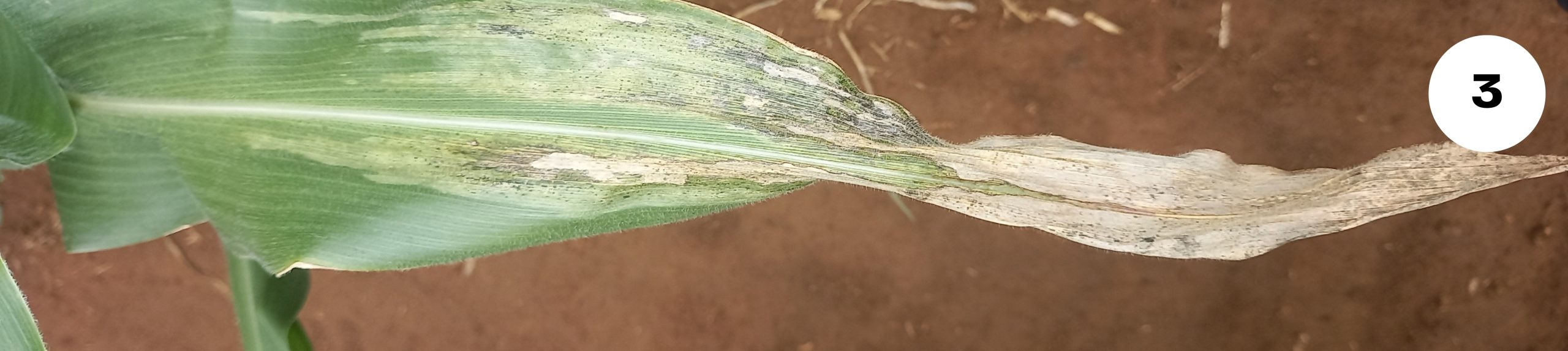 Infection of older plants usually results in leaf blight, the symptoms of which are large tan to grey elongated oval leaf lesions that extend parallel to the leaf veins. Leaf blight lesions on leaves of susceptible maize hybrids are large (6 to >15 cm in length). Initially, they are light green to yellow and quickly become necrotic. On resistant hybrids, lesions are smaller (2 to 6 cm) and reddish. Young lesions appear as streaks of light green tissue with water soaking on the leaf before the tan lesions develop. As these streaks coalesce, dark green to black scattered, water-soaked spots (referred to as freckles) can be seen (Photo 3).