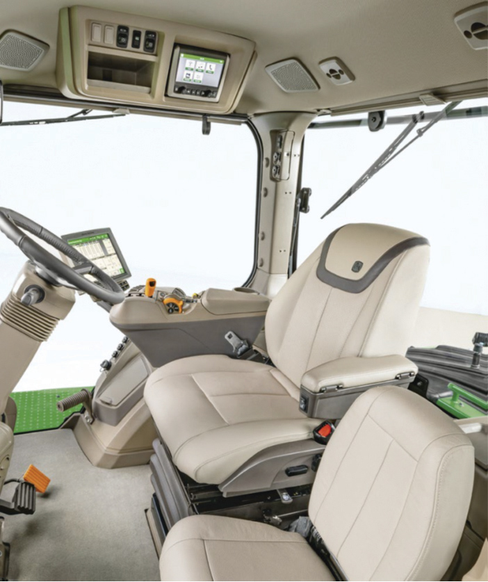Wat sitplekgerief betref, spog John Deere se toppakkette met leersitplekke, aktiewe suspensie, verhitting en selfs ’n masseerder. “Hierdie eienskappe is veral belangrik siende dat operateurs ge­middeld agt tot twaalf uur per dag in die kajuit spandeer,” voeg hy by. Die ActiveSeat™ 2-sitplek, wat in die 7R-, 8R- en 9R-trekkerreekse sowel as John Deere se stropers en spuite pryk, se suspensie werk geïntegreerd saam met die wiel- en voorassuspensie om vibrasies op ongelyke grond te absorbeer.