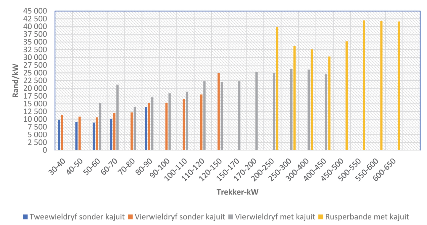 Soos verwag kan word, is daar groot variasie in die koste per kilowatt. Uit die inligting in Grafiek 1 is dit duidelik dat die kleiner trekkers per kilowatt die goedkoopste is; soos die trekkers se kilowatts toeneem, neem die koste per kilowatt ook toe. Die middelslag-vierwieldryftrekkers (met kajuite) tussen 110 en 170 kW se gemiddelde prys per kilowatt is ongeveer R22 500. Die groter vierwieldryftrekkers (met kajuite) tussen 170 en 450 kW kos ongeveer R25 500/kW. Die rusperbandtrekker se koste is weer heelwat hoër as die van die ander groot trekkers. Hierdie pryse het nie veel gestyg oor die afgelope jaar nie.