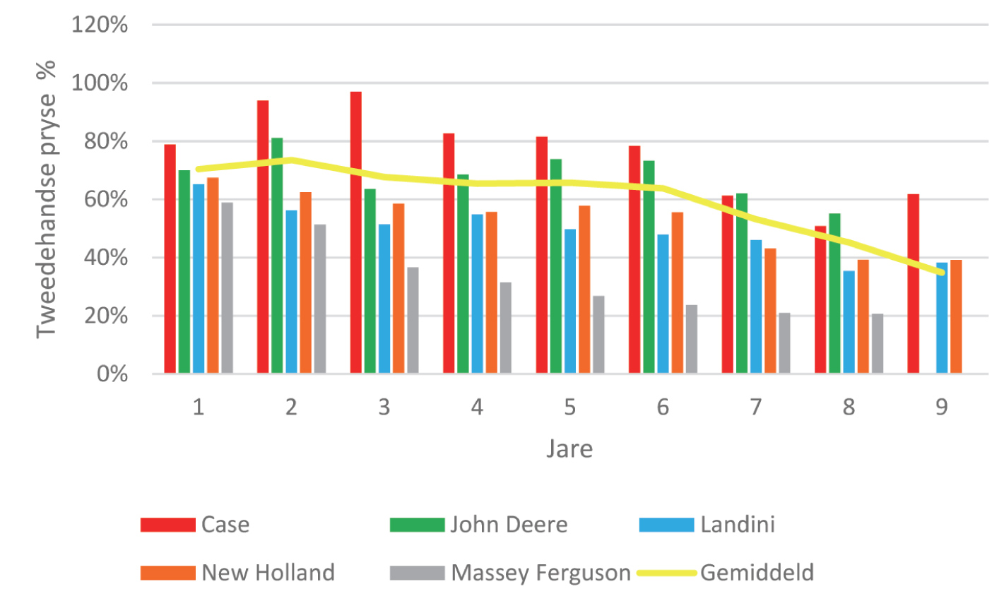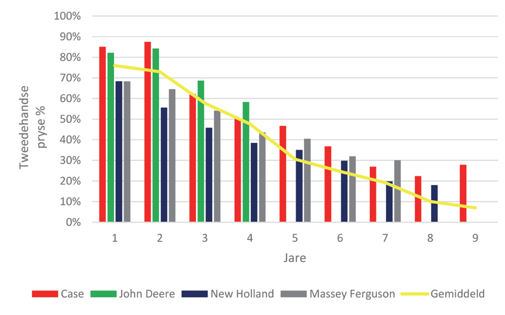 Hier word die trekker se tweedehandse prys teenoor die nuwe prys uitgedruk om sodoende die werklike waardevermindering te sien.