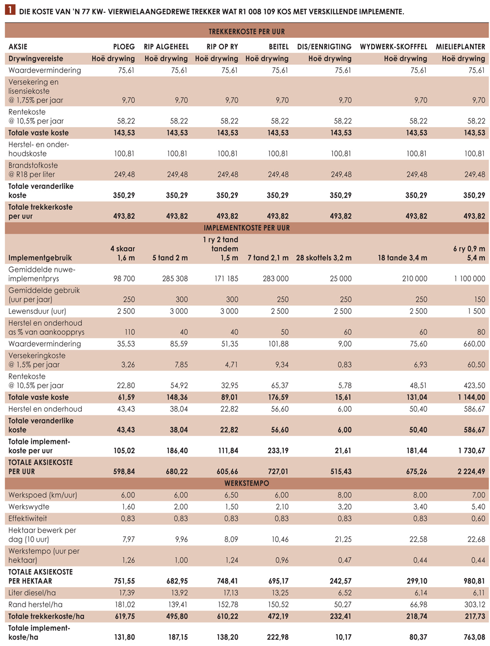 In Tabel 1 en 2 word die koste vir 75 kW- en 250 kW-vierwieldryftrekkers met kappies met verskillende implemente aangetoon. Hierdie berekeninge is aan die hand van bogenoemde verduidelikings gedoen.