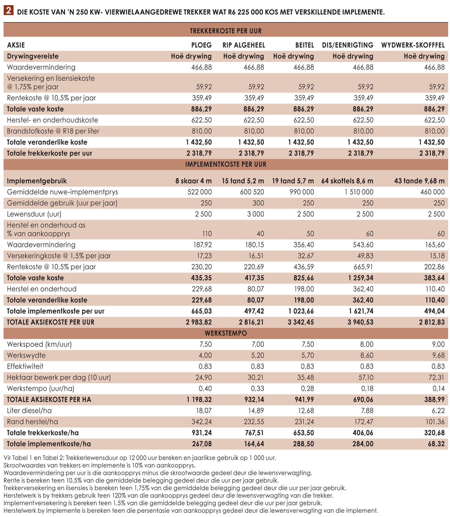 Tabel 2, wat die koste vir ’n 250 kW-trekker wat R6 259 547 kos toon, is ook opgestel deur gebruik te maak van die twee publikasies en dit met die 2025 se gemiddelde nuwe trekker- en implementpryse aan te pas. Daar is aanvaar dat hierdie trekker nie algemeen vir plant gebruik sal word nie, maar dat dit hoofsaaklik swaar werk sal doen.