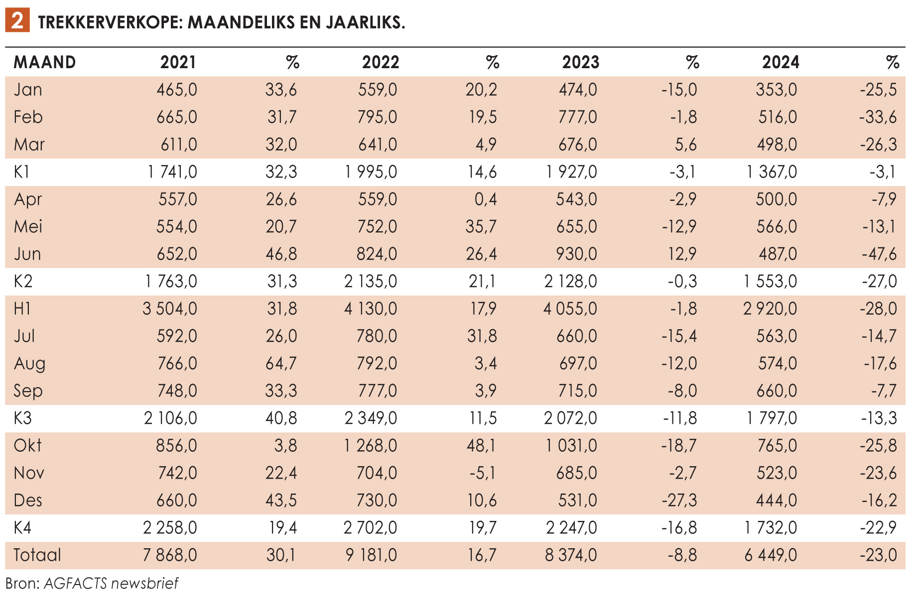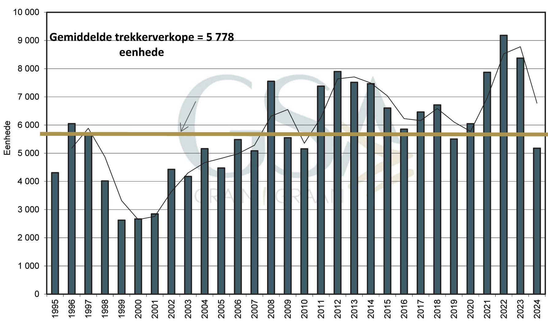 - Trekkerverkope in 2024 het met 23% gedaal teenoor 2023 – die grootste jaar-tot-jaar-daling in die afgelope vier jaar.