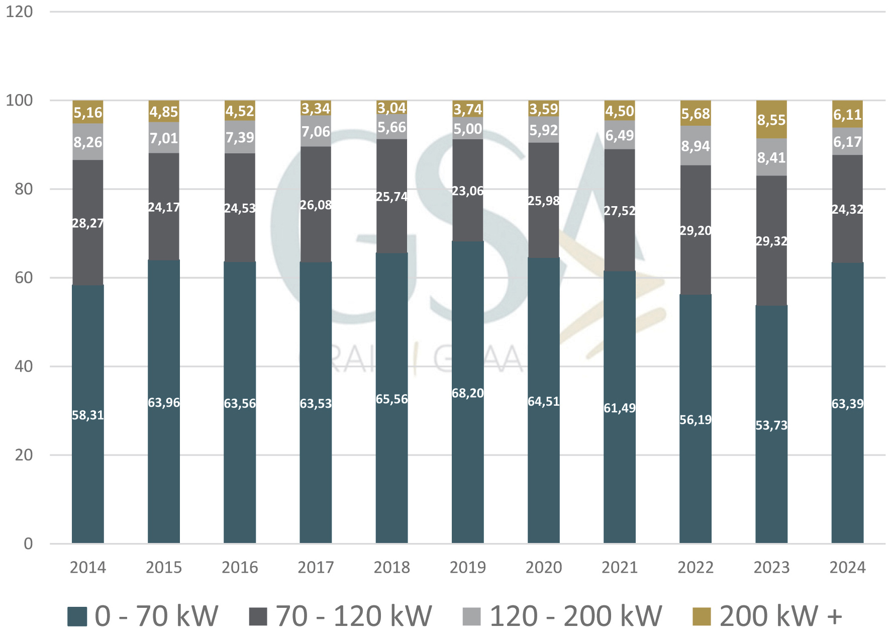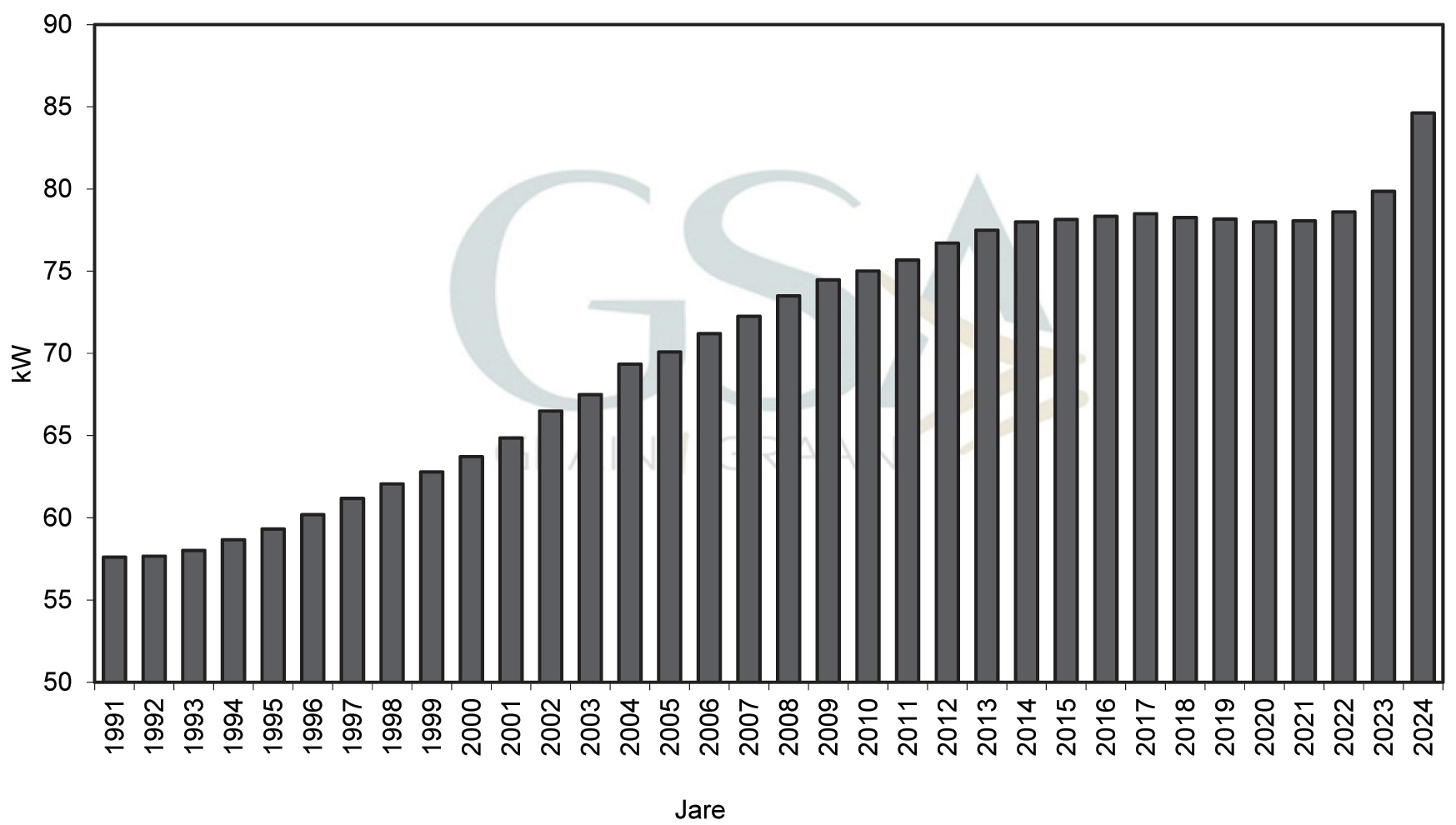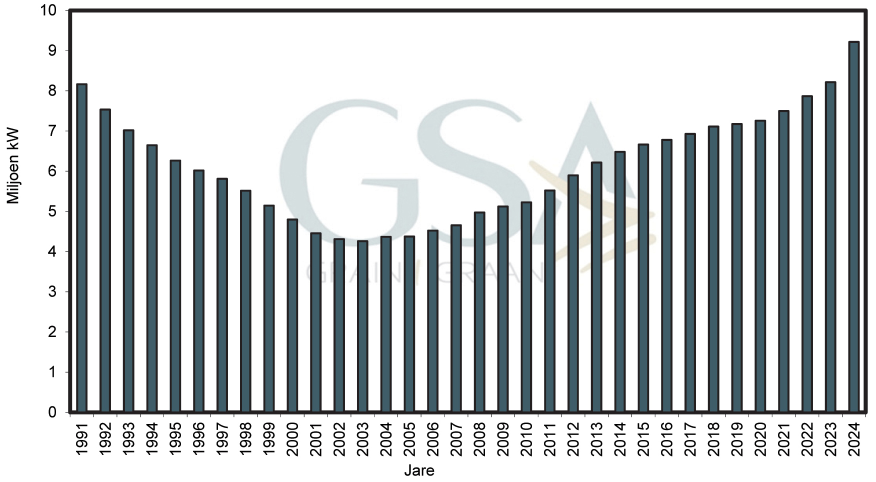 Die gemiddelde trekkrag (kW) van trekkers in die totale trekkervloot het die afgelope paar jaar geleidelik toegeneem. Hierdie toename in gemiddelde trekkrag kan gesien word in Grafiek 5; dit het toegeneem van 63,7 kW (20 jaar gelede) tot 75 kW (in 2010) en het in 2021 op 78,1 kW te staan gekom. Hierdie getal het effens verhoog na 78,6 kW in 2022. In 2024 blyk dit dat die gemiddelde trekkrag ’n sprong gemaak het tot 85 kW.