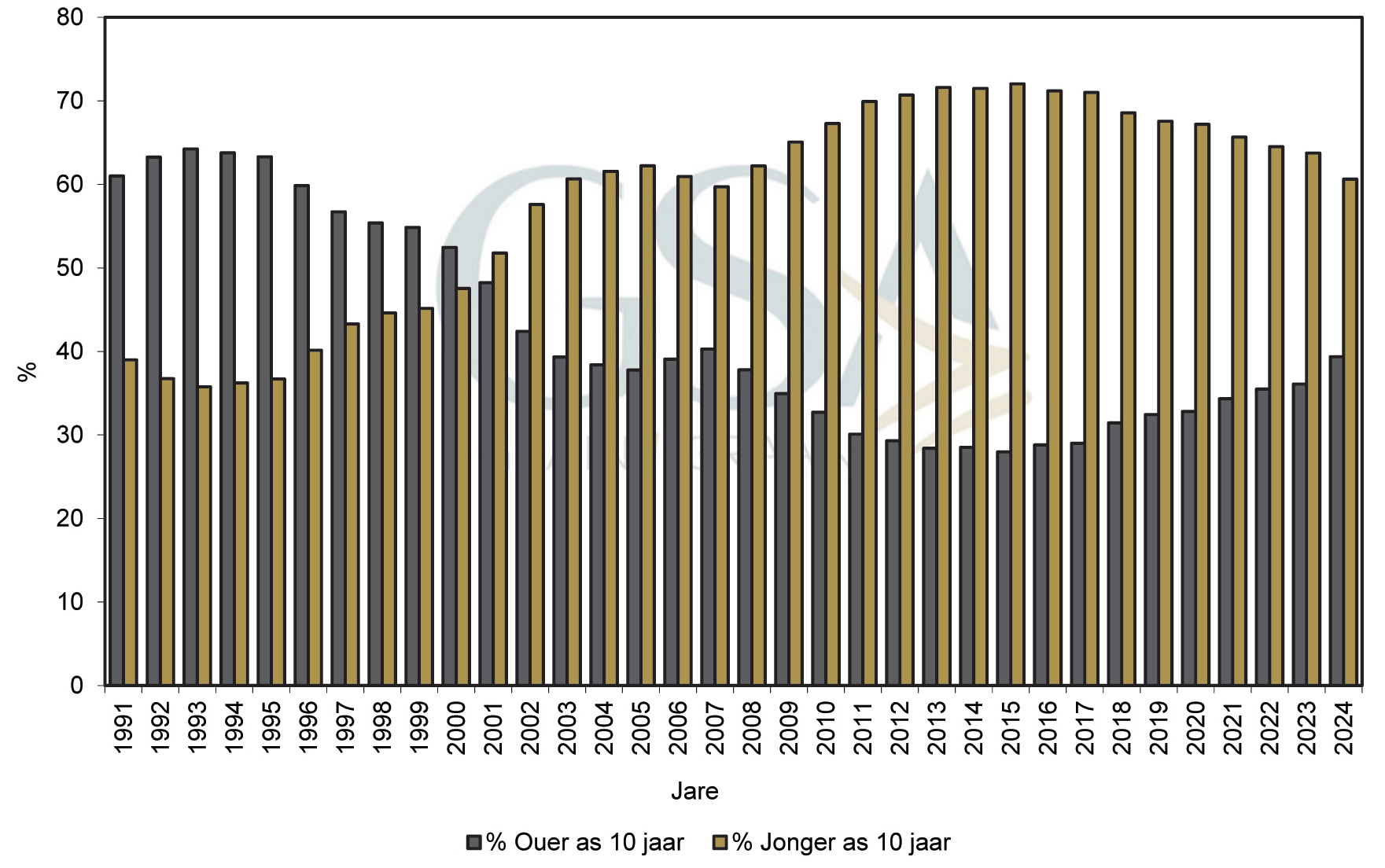 In vroeë jare (1991 tot 2000) was daar ’n hoër persentasie nuwe trekkers. Vanaf ongeveer 2005 begin die persentasie ouer trekkers toeneem. Teen 2024 is die meerderheid van trekkers ouer as tien jaar – wat dui op ’n verouderende vloot. Die toename in ouer trekkers kan dui op minder vervanging of aankoop van nuwe trekkers, wat moontlik ’n aanduiding kan wees van ekonomiese druk, hoë koste van nuwe trekkers of ’n afname in landboubeleggings.
