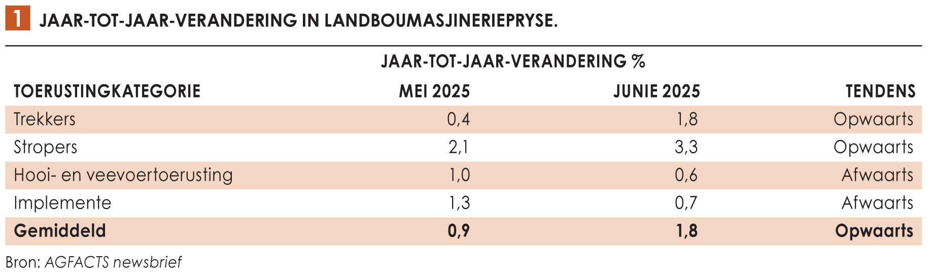 Prysveranderings op ’n jaargrondslag van die verskillende kategorieë landboumasjinerie kan in Tabel 1 waargeneem word. Landboumasjineriepryse het vanaf Junie 2024 tot