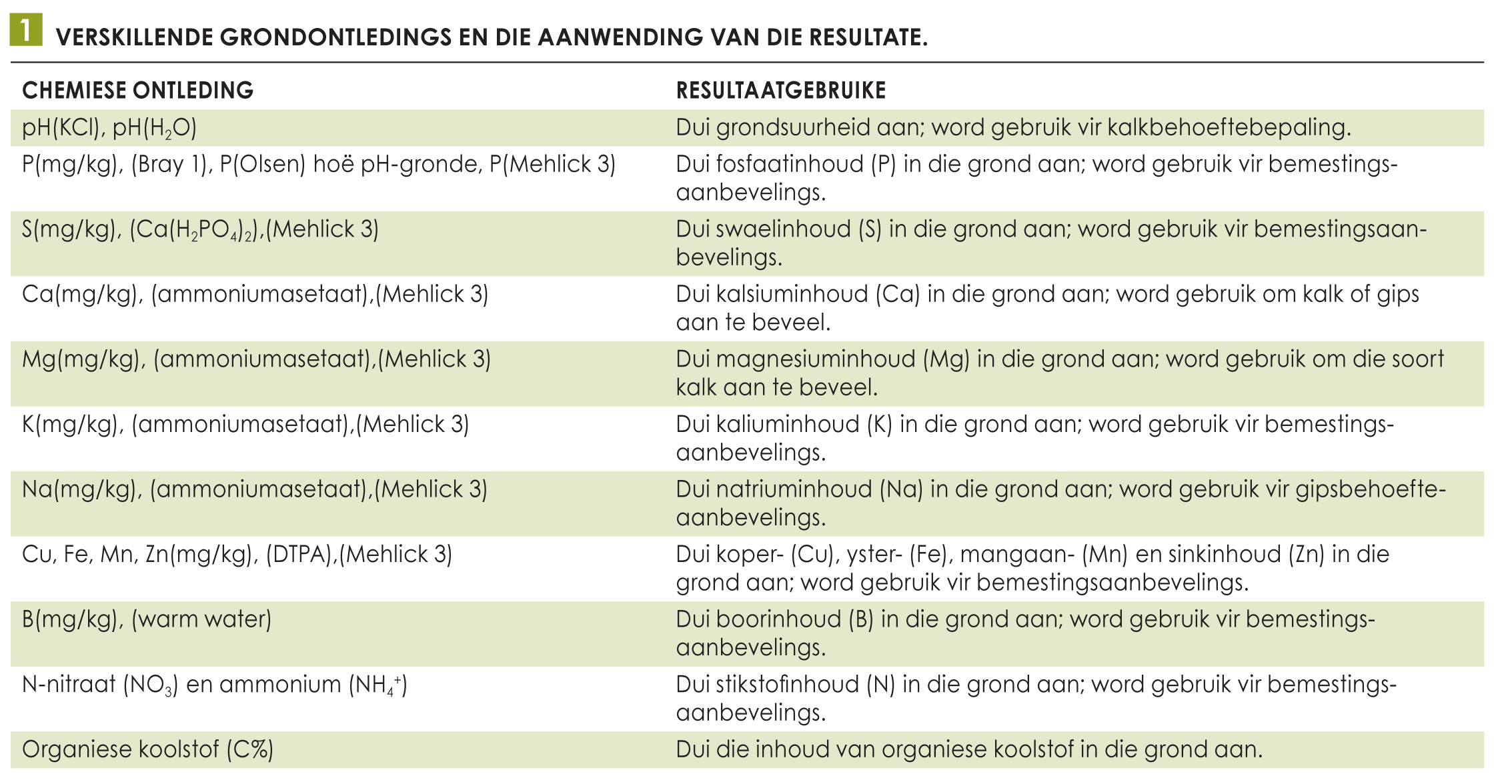Maar wat kry ’n mens alles uit ’n grondontleding en hoekom moet al die toetse gedoen word? In Tabel 1 word die meeste ontledingsresultate aangedui asook waarvoor hulle aangewend word.