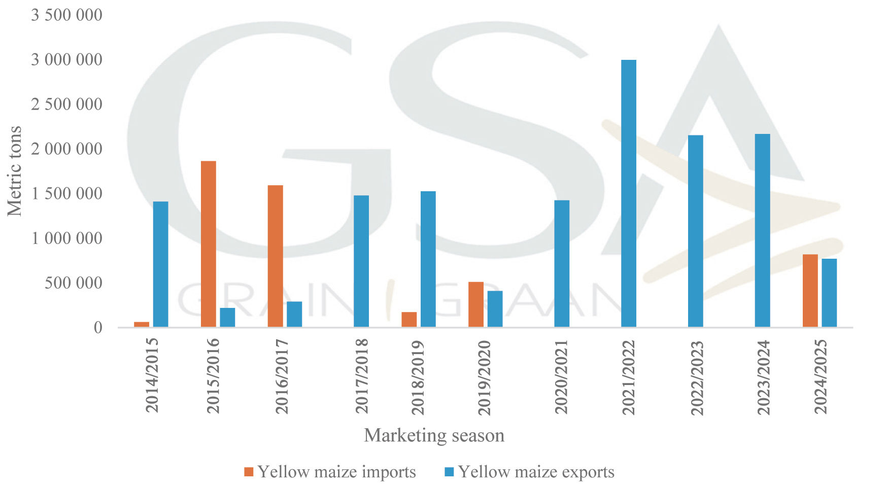 The imported yellow maize was consumed locally to meet demand (and not re-exported). The demand was primarily from the animal feed manufacturing industry, which consumed 6 million tons in the previous season.