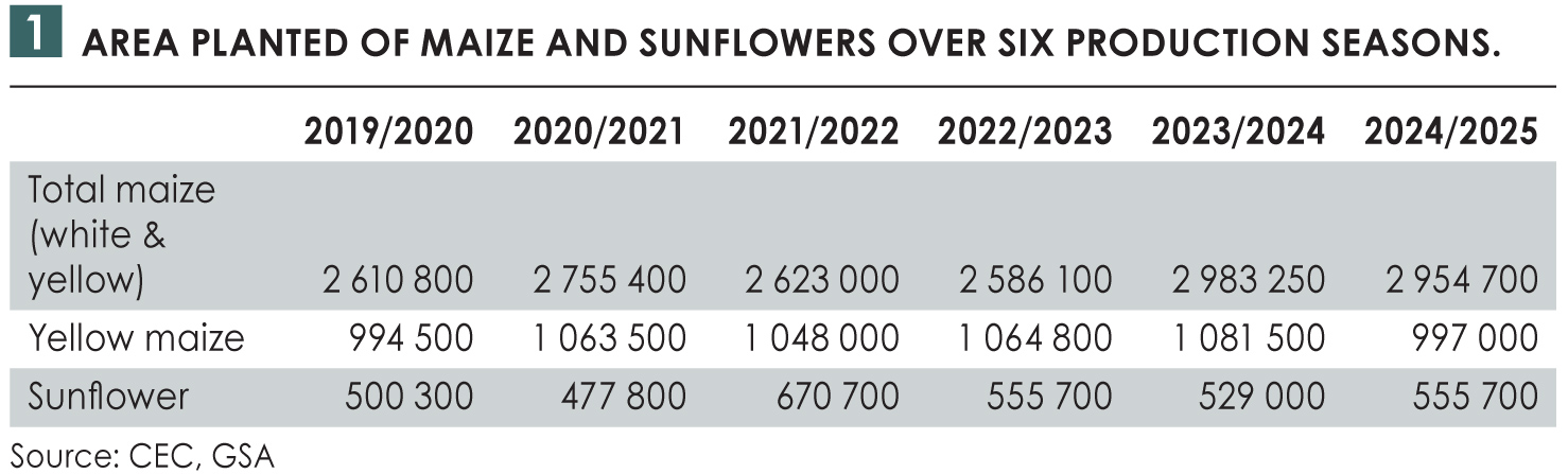According to the fifth production estimate released by the Crop Estimates Committee (CEC), the total area planted of yellow maize for the current season is 997 000 ha, an 8,13% decline from the 1 081 500 ha planted in the 2023/2024 season (see Table 1). In contrast, the area planted of sunflowers increased by 4,92%. The switch to planting sunflowers was primarily influenced by climatic conditions which favoured shorter-season crops, and attractive global oilseed prices. At the end of October 2024, sunflower Safex prices peaked above R10 000/ton for the first time since February 2023.