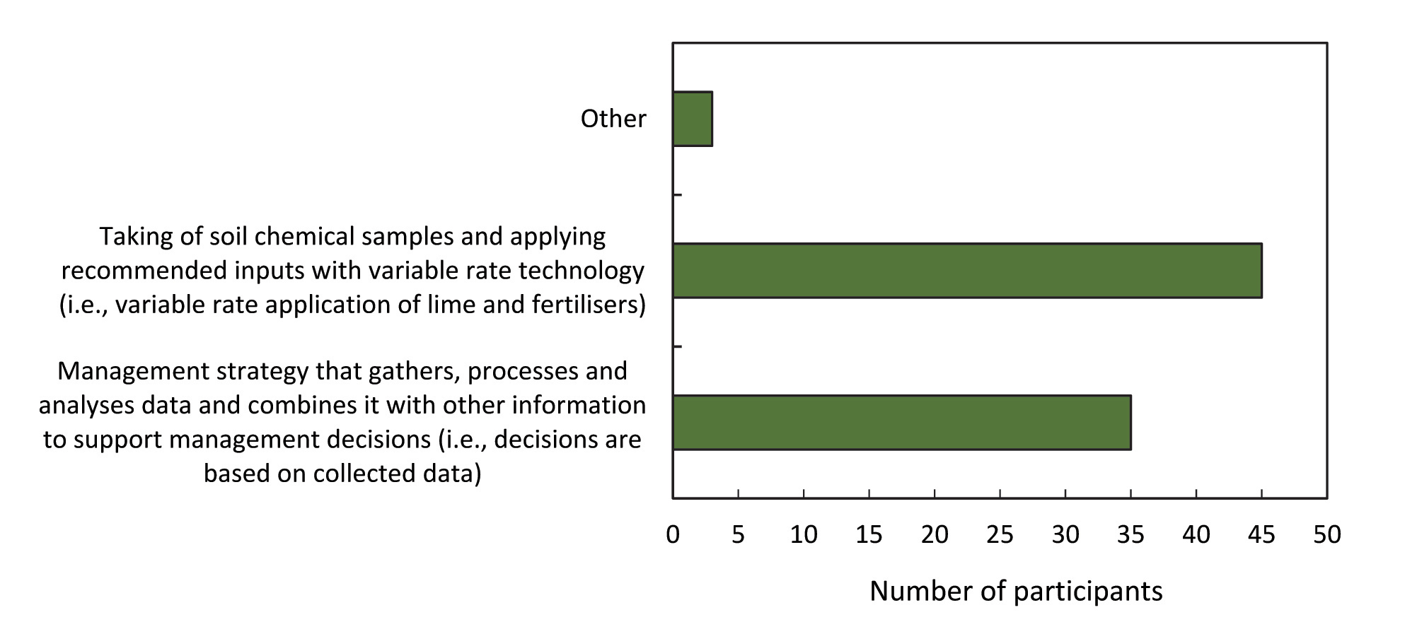 Management zones, which combine grid soil samples and variable rate applications, are sub-field areas within fields that exhibit similar characteristics. Different approaches exist to delineate these zones on farms. This approach enables more precise application of inputs, optimises productivity, reduces costs, and supports sustainable crop production practices. Sixty percent of participants indicated that they make use