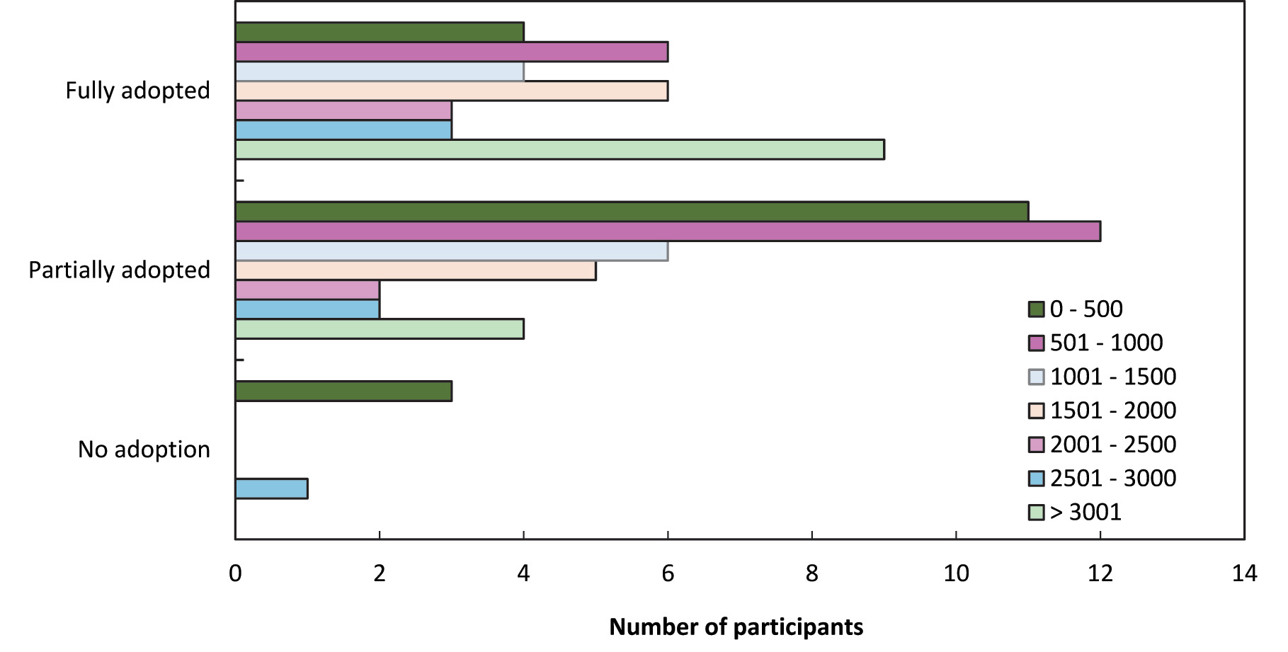 Graph 2: Number of participants grouped by farm size indicating their adoption of precision agriculture in terms of fully adopted, partially adopted, and no adoption.