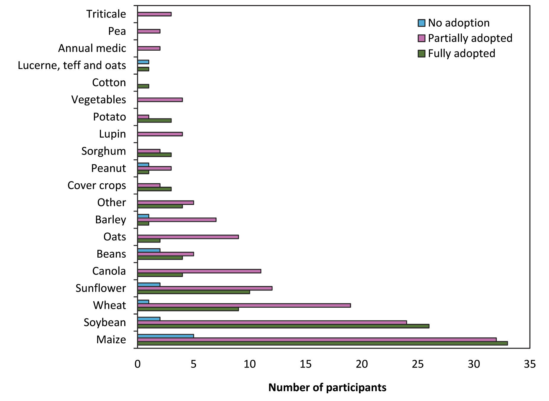 Maize crop production is largely done using precision agriculture practices, with participants either having full or partial adoption rates. Only 7% (n = 5) participants indicated that they do not utilise any form of precision agricultural practices. A similar trend is seen in soybean production systems, with 4% (n = 2) respondents indicating no adoption, with fully and partially adopted begin the highest.
