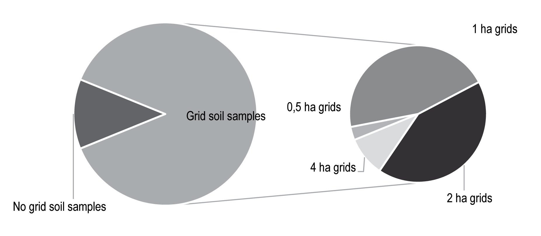 Of those taking grid soil samples, most preferred sizes are 1- or 2-ha grids, although some used finer or coarser grids depending on field variability. Over half of participants also had access to soil classification or physical property maps, although many of these were created some time ago and may not reflect current conditions.