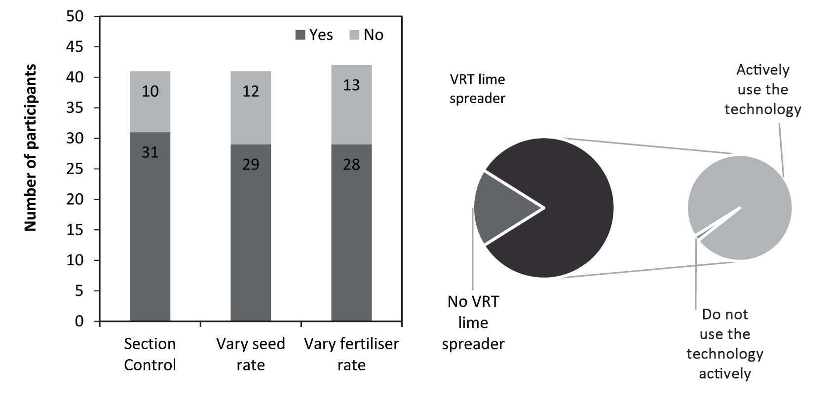 Variable rate technology is necessary for adjusting the application of seeds and other inputs based on field-specific variability. Thirty-one participants indicated that they do not have variable rate technologies on their farms. For the remaining 41 who have the technology, the spread of section control, variable seeding rate, and variable fertiliser rate is indicated in Graph 6.