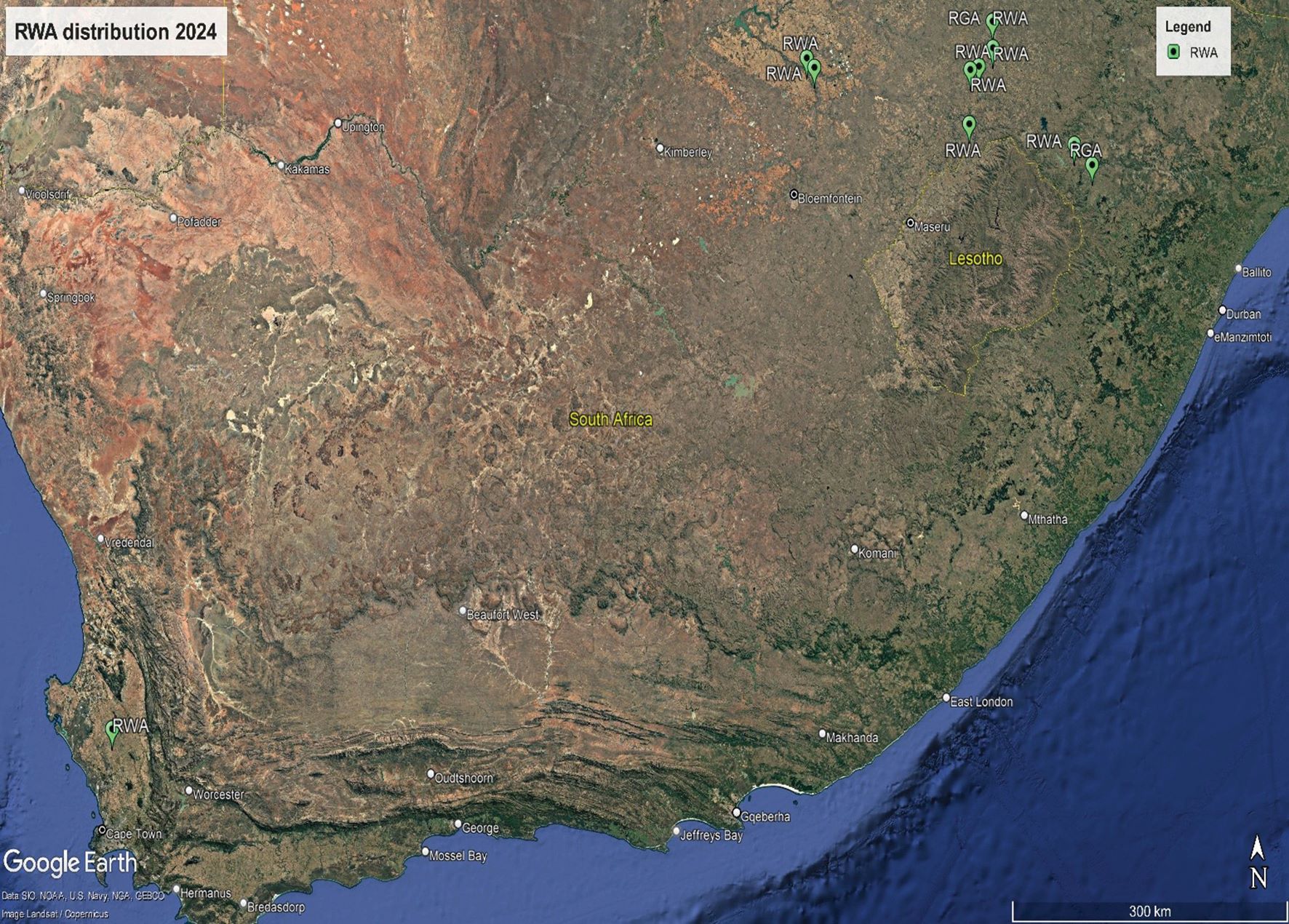Russian wheat aphid (RWA) is very adaptable to selection pressure and persists in the wheat production areas of South Africa despite management practices. As a result of selection pressure, five RWA biotypes occur in South Africa in response to deployment of RWA-resistant cultivars. The recently recorded and most virulent biotype is RWASA5 and there is no current dryland wheat cultivar on the market in South Africa with adequate resistance against this biotype. The widespread use of limited active ingredients against RWA is also resulting in a susceptibility shift in RWA populations in the wheat production areas of South Africa.