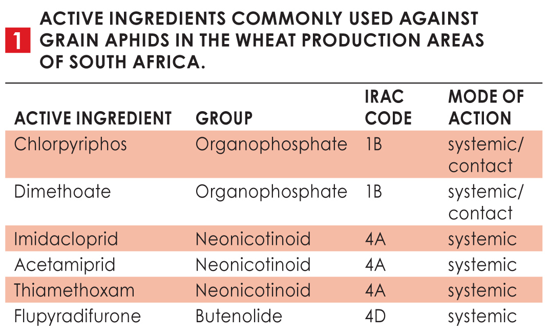 The shift in susceptibility and ultimate development of resistance against a specific active ingredient in the RWA population will depend on the widespread and persistent use of the active ingredient. Any management practice or change in the environment will exert selection pressure on RWA populations. To mitigate the development of insecticide resistance in RWA populations it will be necessary to limit the selection pressure of chemical control on RWA. This can be achieved by not only rotating between active ingredients, but also between groups and alternative management practices.