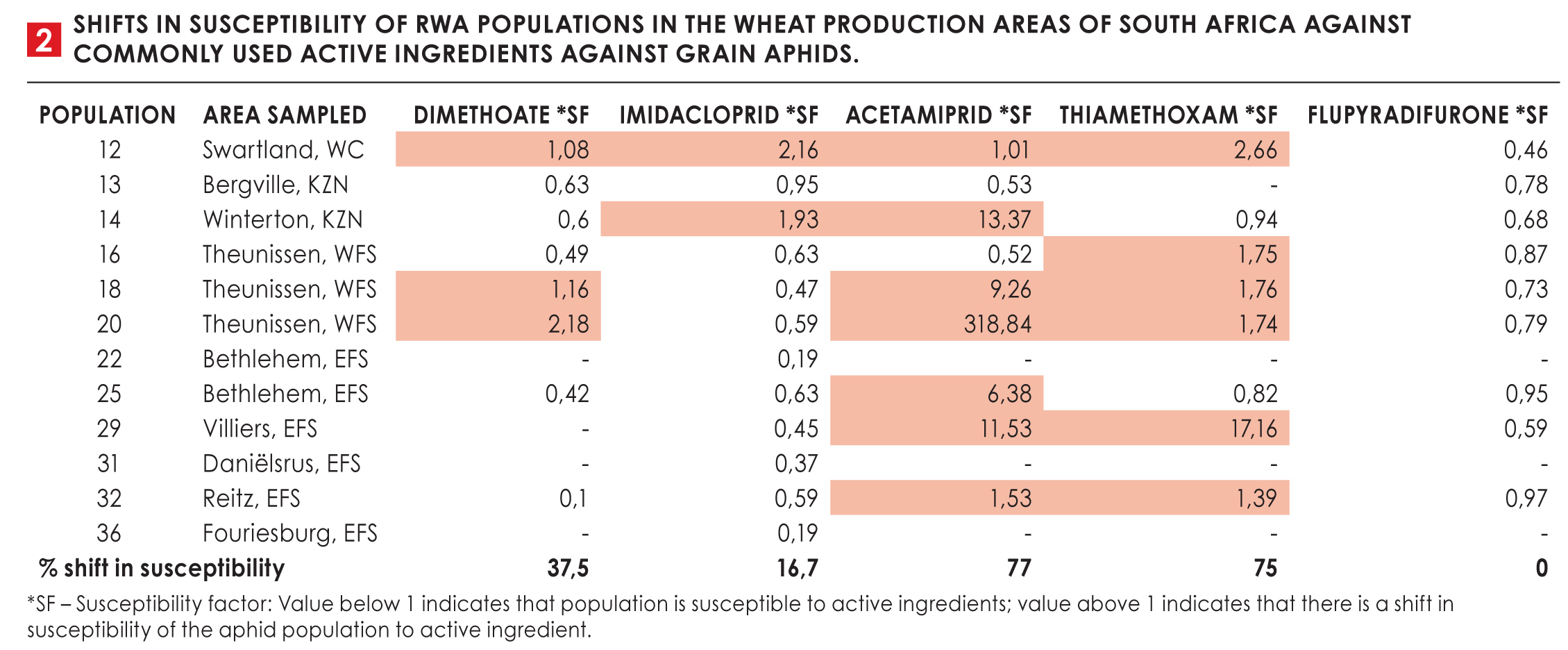 Russian wheat aphid (RWA) is very adaptable to selection pressure and persists in the wheat production areas of South Africa despite management practices. As a result of selection pressure, five RWA biotypes occur in South Africa in response to deployment of RWA-resistant cultivars. The recently recorded and most virulent biotype is RWASA5 and there is no current dryland wheat cultivar on the market in South Africa with adequate resistance against this biotype. The widespread use of limited active ingredients against RWA is also resulting in a susceptibility shift in RWA populations in the wheat production areas of South Africa.