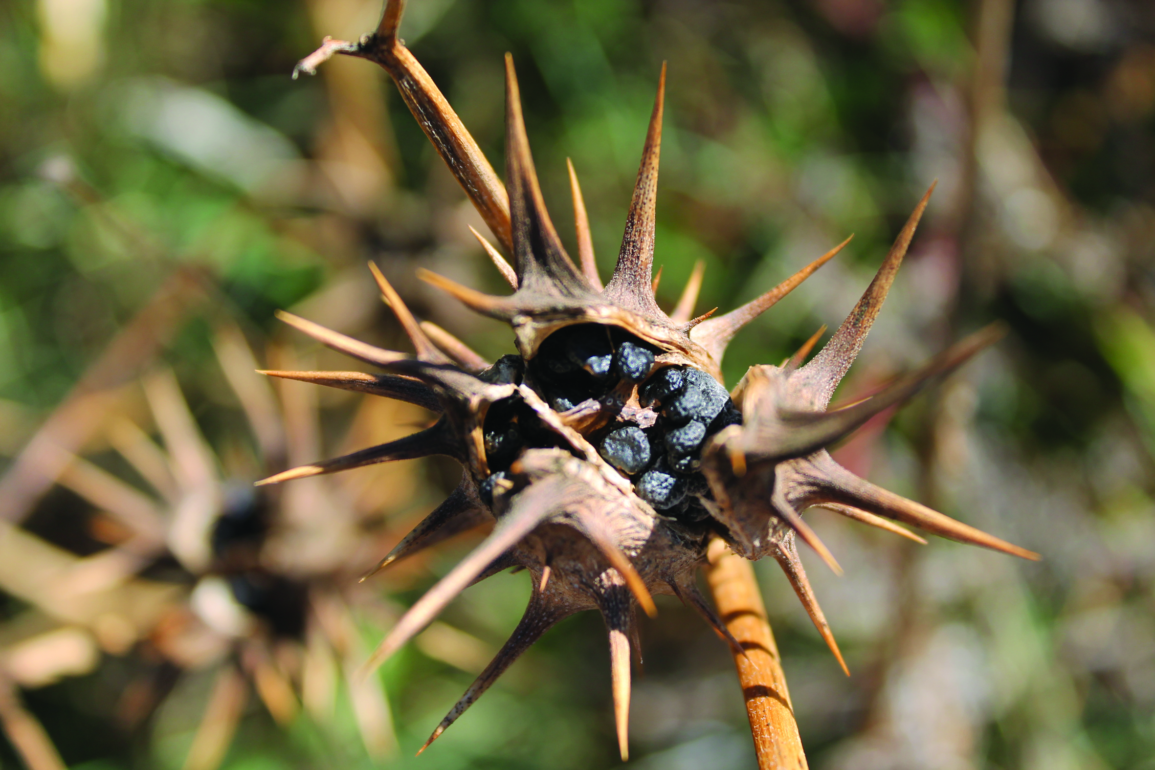 Datura-vrug met sade wat toksiese verbindings bevat en die rede is dat sade nie in graanbesendings verdra word nie. Die sade kan na berig word vir langer as 100 jaar in grond kiemkragtig bly.