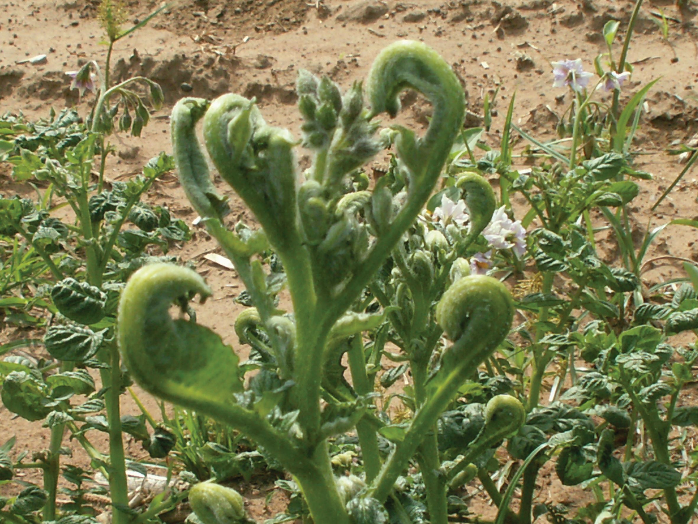 Vir sekere onkruiddoders is die skadesimptome onmiskenbaar uniek – hierdie is skadesimptome wat die onkruiddoder pikloram (nie geregistreer vir die gewas nie) by aartappels veroorsaak het. Let wel: 2,4-D-onkruiddoder veroorsaak presies dieselfde simptome omdat dit en pikloram se meganisme van werking ooreenstem. Foto: Dr C Reinhardt