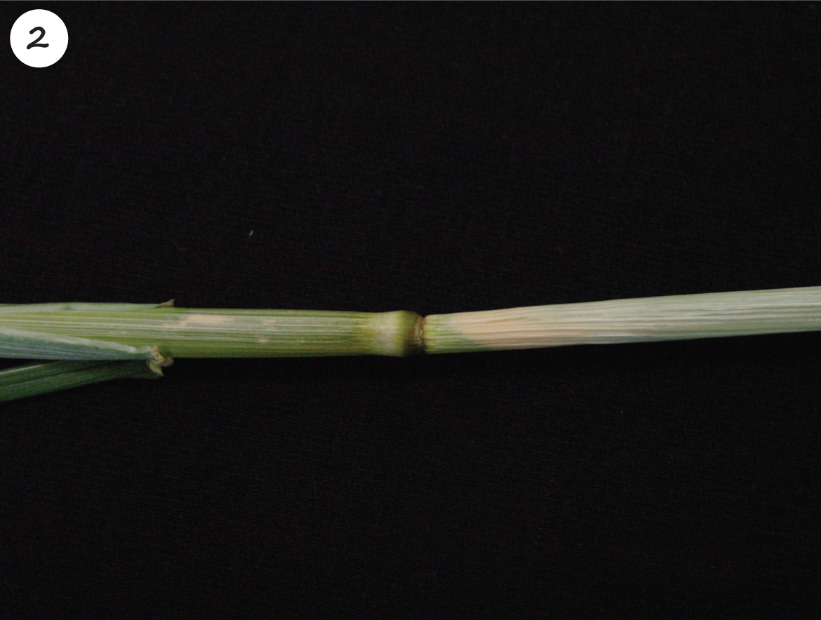 Indien die groeipunt beskadig is, bly die halm vir ’n periode groen nadat groei gestaak is. In sommige gevalle verskyn ’n bruin (dooie) blaar waar die laaste blaar se blaarskyf uit die blaarskede ontwikkel. Rypskade op hierdie stadium kan ’n samestelling van normale halms en halms wat ontstaan het as gevolg van hergroei tot gevolg hê. Dit kan tot oneweredige rypwording lei en selfs oesverliese veroorsaak. Halms wat op hierdie en latere stadiums aan ryp blootgestel is, kan op die onderste gedeeltes van die halms ’n verkleuring, grofheid, letsels en vergroting van knooppunte toon (Foto 2). Beskadigde plante se halms breek dikwels by die aan­getaste gedeeltes.