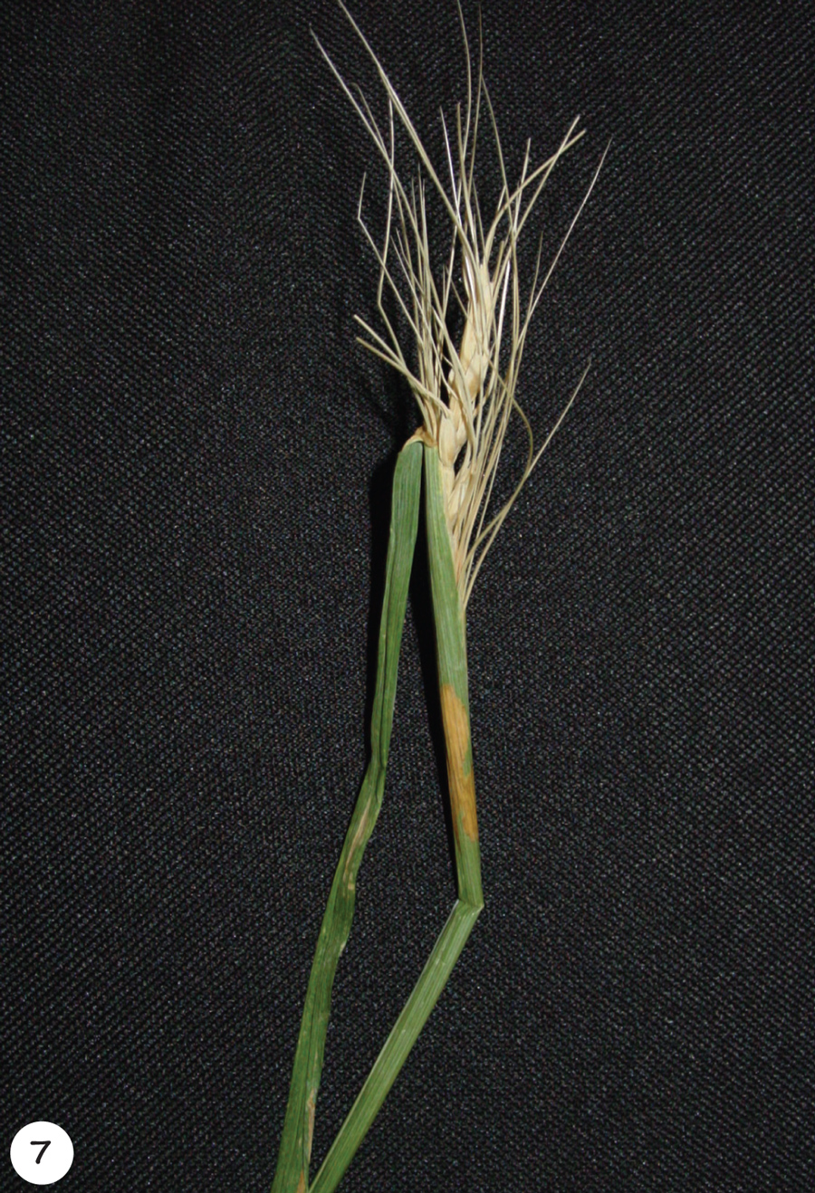 Die onderste gedeelte van halms kan verkleuring, grofheid, letsels en vergroting van knooppunte toon.