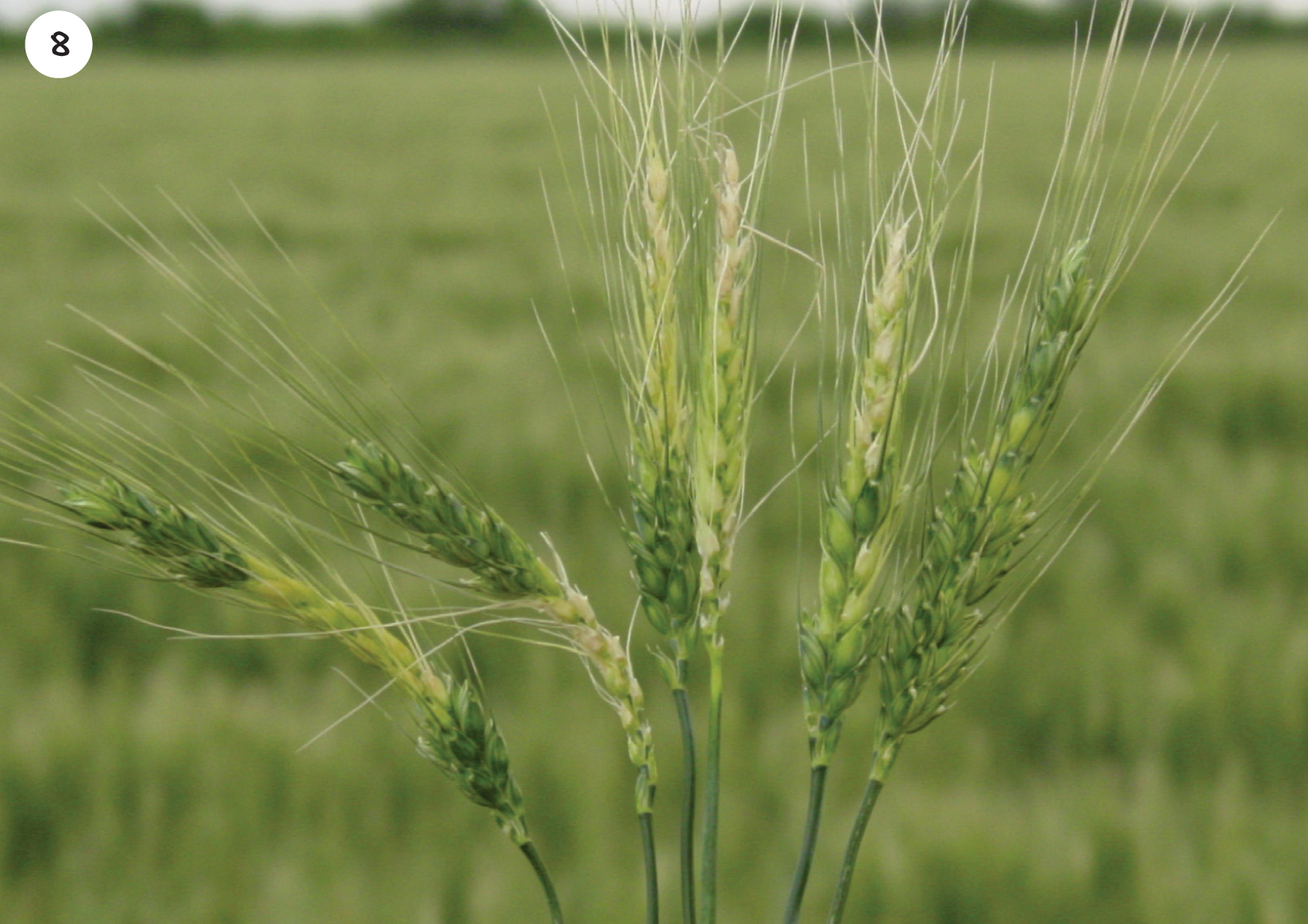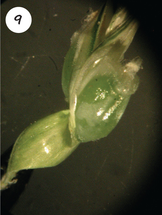 Aangesien die blomproses by koring vanaf ongeveer een derde van die basis van die aar begin en dan op- en afwaarts voltooi word oor ’n periode van twee tot vyf dae, kan klein verskille in die stadium wanneer ryp voorkom veroorsaak dat sowel vol as leë of gedeeltelik gevulde are voorkom (Foto 8).