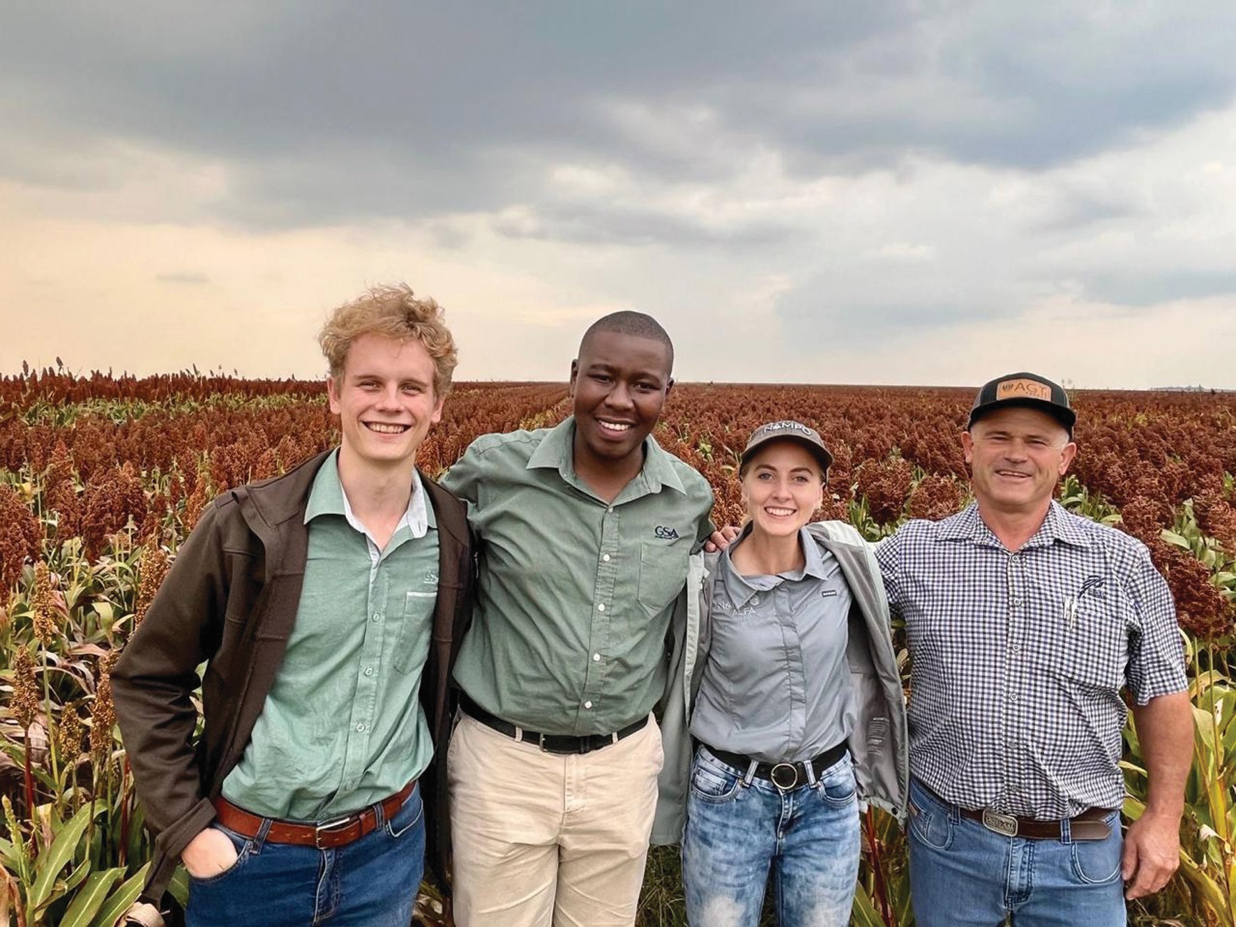 Graan SA se landbou-ekonoom-interns, Gerhard Burger, Mlibo Qotoyi en Strelza van Aardt, saam met Ebert du Plessis, Graan SA-Raadslid, op wie se plaas die inligtingsdag aangebied is.