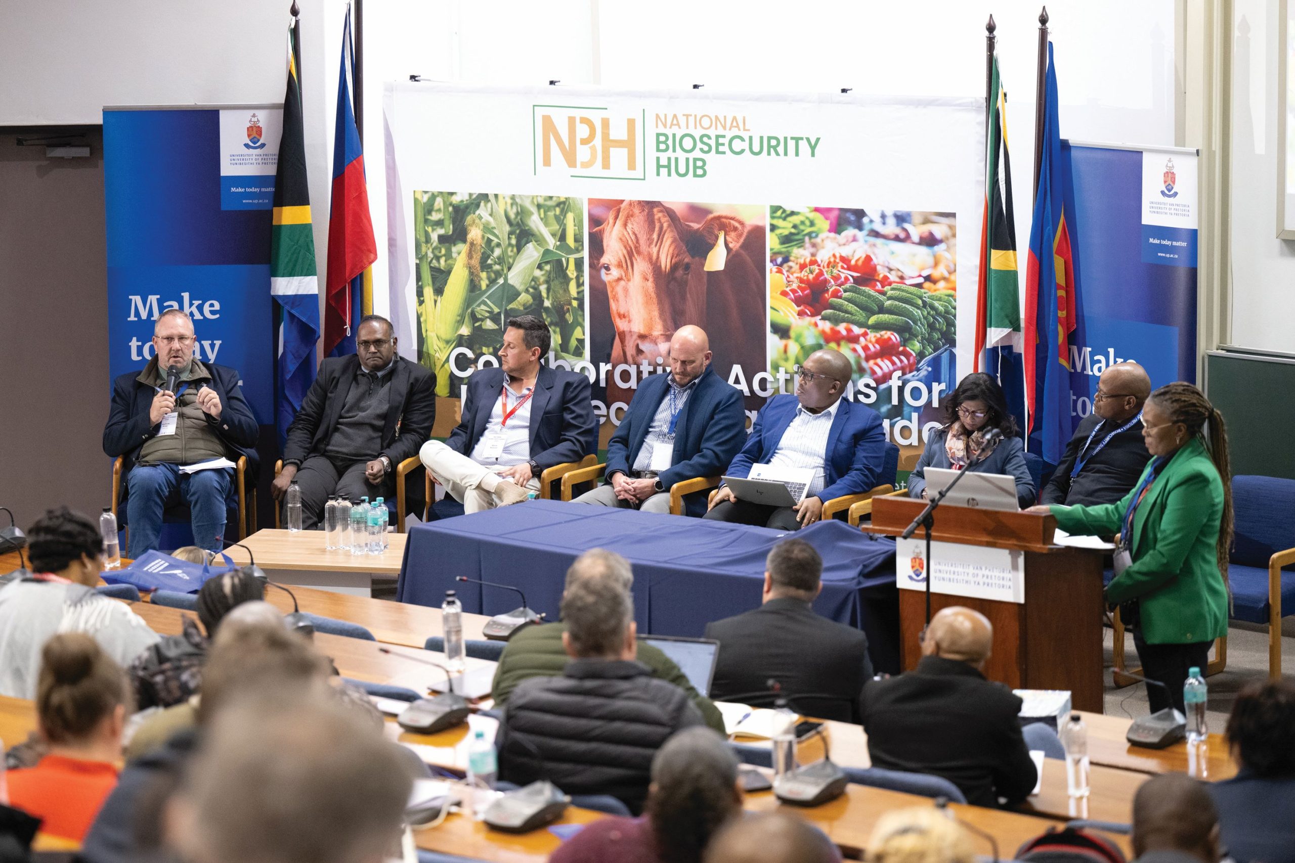 Key voices from agriculture and biosecurity engage in a panel discussion at the summit. Panellists: Richard Krige (chairperson, Grain SA), Prof Vinny Naidoo (dean, Faculty of Veterinary Science, University of Pretoria), David Niemann (COO, Sernick Group), Dewald Olivier (CEO, Red Meat Industry Services), Dr Litha Magingxa (CEO, Agricultural Research Council), Dr Maneshree Jugmohan-Naidu (chairperson, National Biosecurity Hub; director: Biotechnology, Department of Science, Technology and Innovation), Dr Boitshoko Ntshabele (CEO, Citrus Growers Association), and Dr Marinda Visser (moderator and coordinator, National Biosecurity Hub).