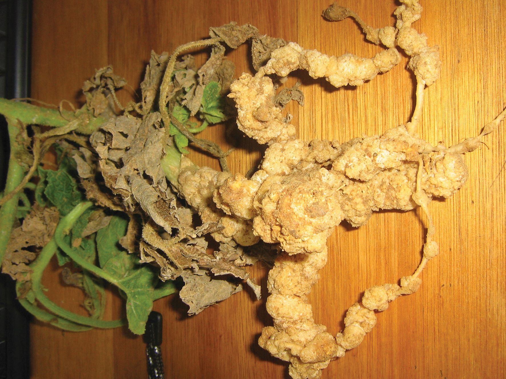 Knopwortelaalwurmgalle wat op ’n pampoenplant se wortels oorgeneem het.