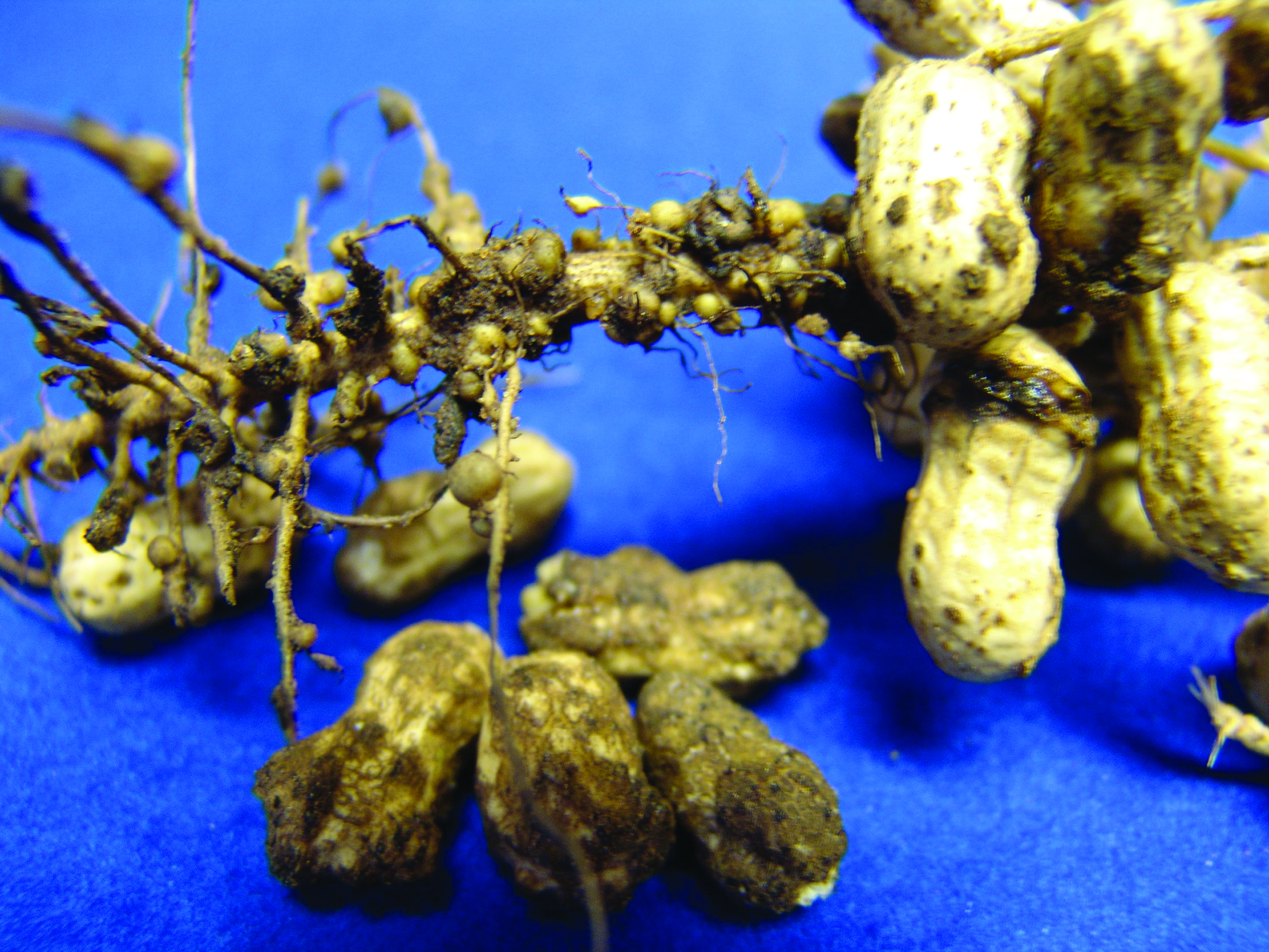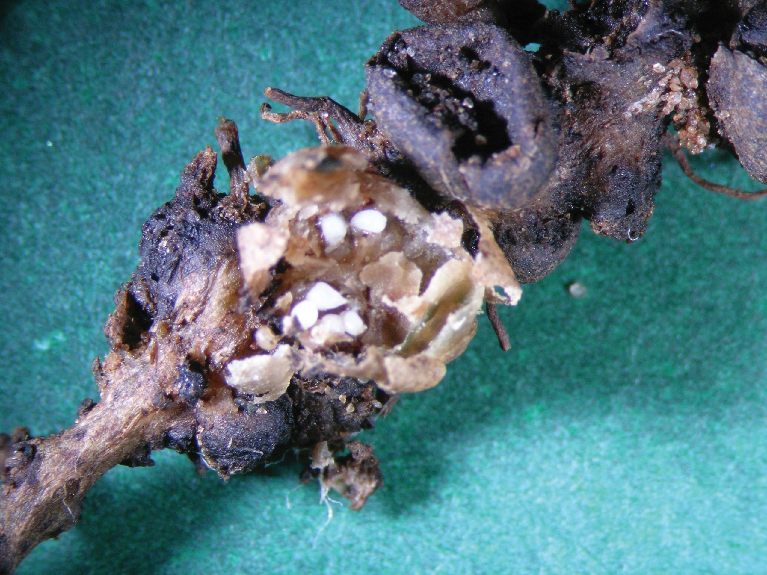 Die wit “balletjies” in die oopgekrapte stikstofbindende bakteriese knoppie is knopwortelaalwurmwyfies wat die werking van die knoppies negatief beïnvloed.