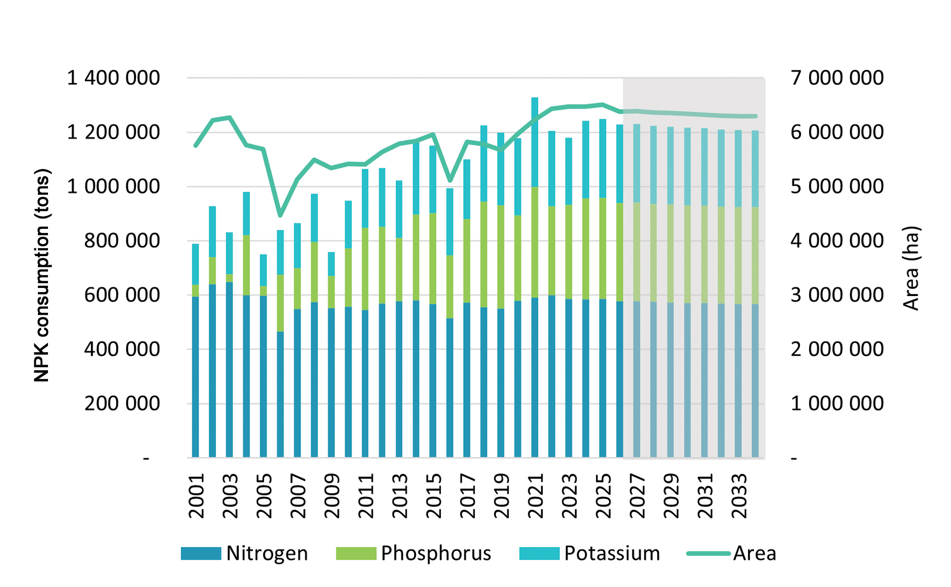 Over the past two decades, consumption patterns of nitrogen, phosphorus, and potassium have diverged notably. Nitrogen use showed relative minor fluctuations – it peaked at 648 000 tons in 2003, then declined by 28% to 466 750 tons in 2006 due to reduced cultivated area. From 2007 onwards, nitrogen consumption stabilised at around 560 000 tons annually, with only modest average annual growth of 0,3% through 2024.
