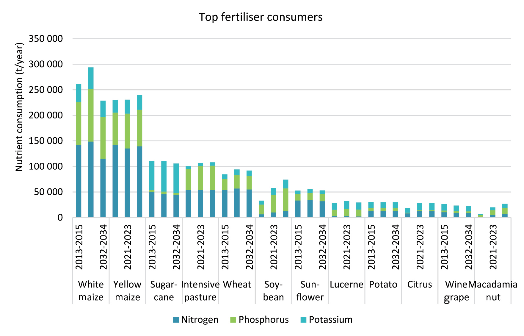 Figure 2: Historic, current, and projected nitrogen, phosphorus, and potassium fertiliser consumption across the major crop types in South Africa. Data obtained from BFAP and industry stakeholders.
