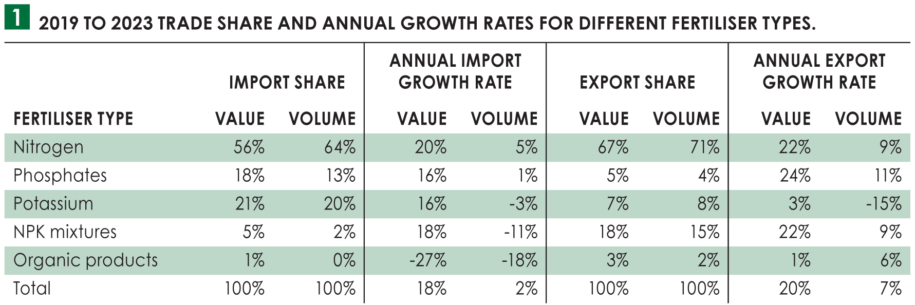Table 1 illustrates the average share of fertiliser imports and exports by value and volume from 2019 to 2023, along with their growth rates. During this period, nitrogen (N) fertiliser products dominated imports, making up 56% of total import value and 64% of import volume, followed by potassium (K) and phosphorus (P). NPK mixtures and organic fertilisers only account for a small share of South Africa’s imports. The total value of imports increased at an average annual rate of 18% between 2019 and 2023, while total import volumes grew modestly by 2% per year. Notably, global prices for nitrogen- and phosphorus-based fertilisers increased significantly over this period, driven by supply challenges in response to geopolitical tensions, supply chain disruptions, and the COVID-19 pandemic.