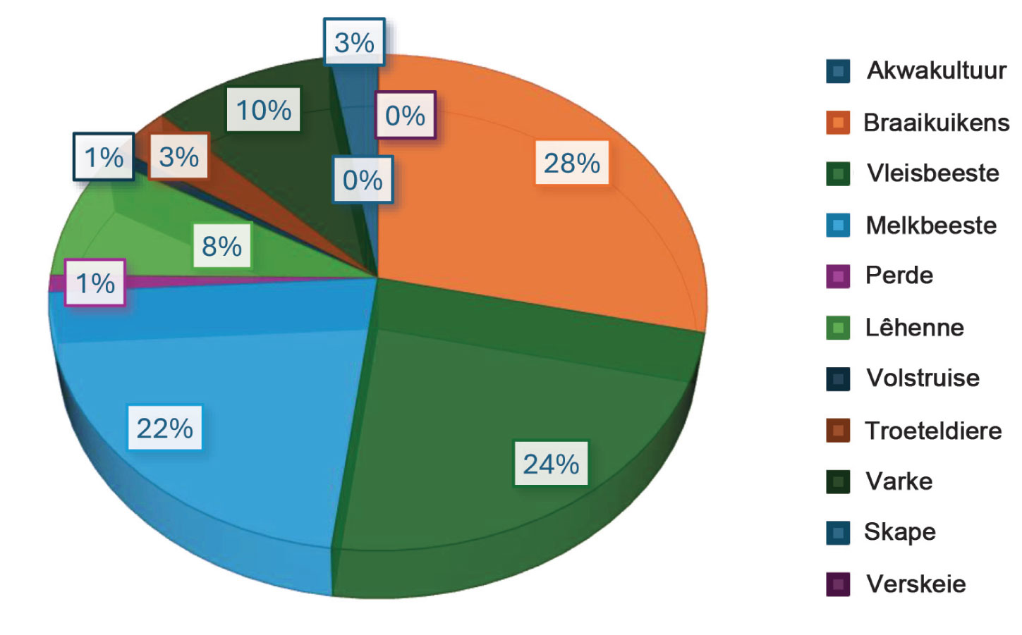 Met bykans 3,7 miljoen ton voer wat in 2024 deur die braaikuikenbedryf alleen gebruik is, speel hoenders ’n bepalende rol in die vraag na veral geelmielies en sojaboonoliekoek. Volgens die jongste projeksies van die Proteïennavorsingstigting (PNS) het die totale vraag na dierevoere in 2024 sowat 12,45 miljoen ton beloop. Hiervan het die pluimveebedryf – braaikuikens en lêhenne saam – meer as 37% van die verbruik verteenwoordig. Dit beteken dat enige verandering in hoendergetalle of produksiesiklusse ’n direkte impak op die graanwaardeketting het.