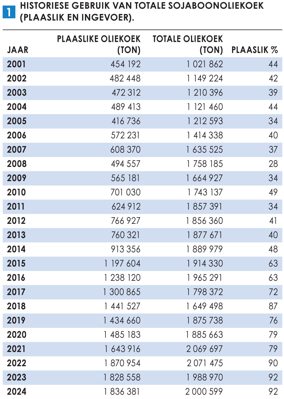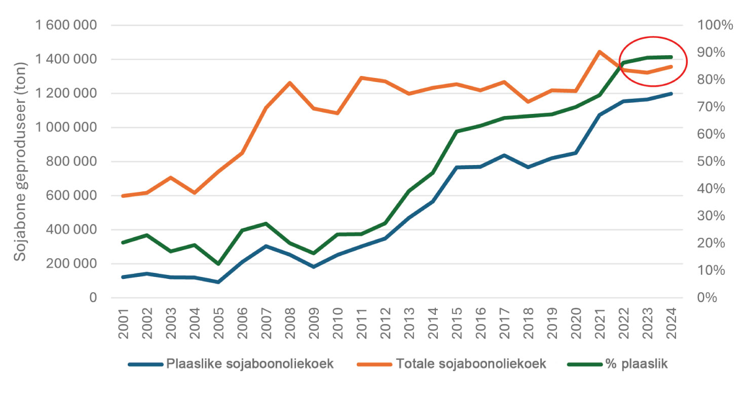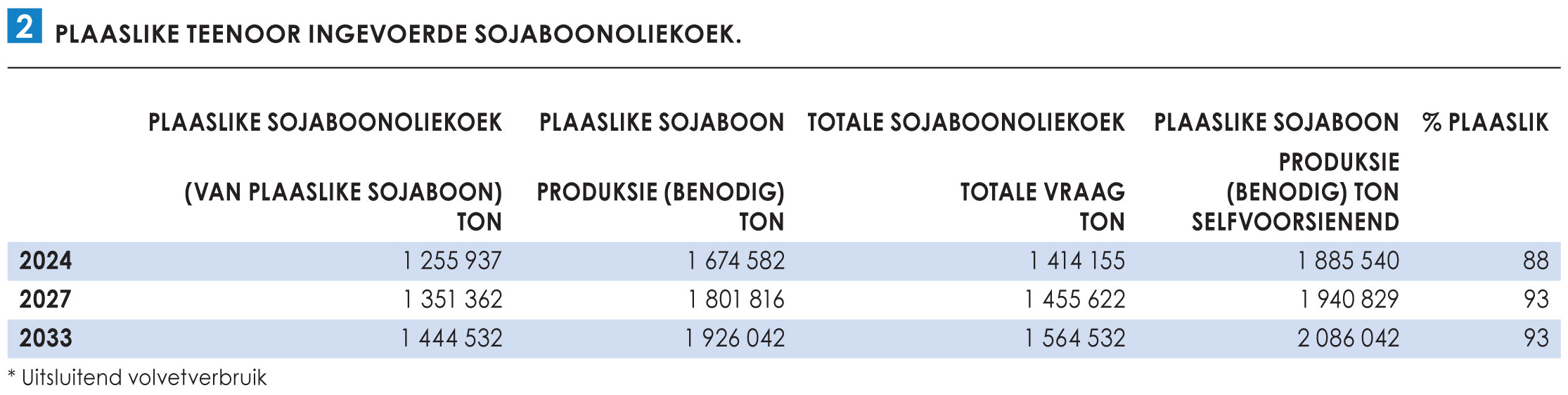 ’n Groot deel van oliekoekproduksie vind in die binneland plaas en moet na kusprovinsies soos die Wes- en Oos-Kaap vervoer word. In sekere jare ondersteun gunstige persmarges ’n toename in plaaslike verbruik. Om aan die binnelandse vraag teen 2033 te voldoen sal ongeveer 2 086 042 ton sojabone benodig word. Plaas-like teenoor ingevoerde sojaboonoliekoek word in Tabel 2 gesien.