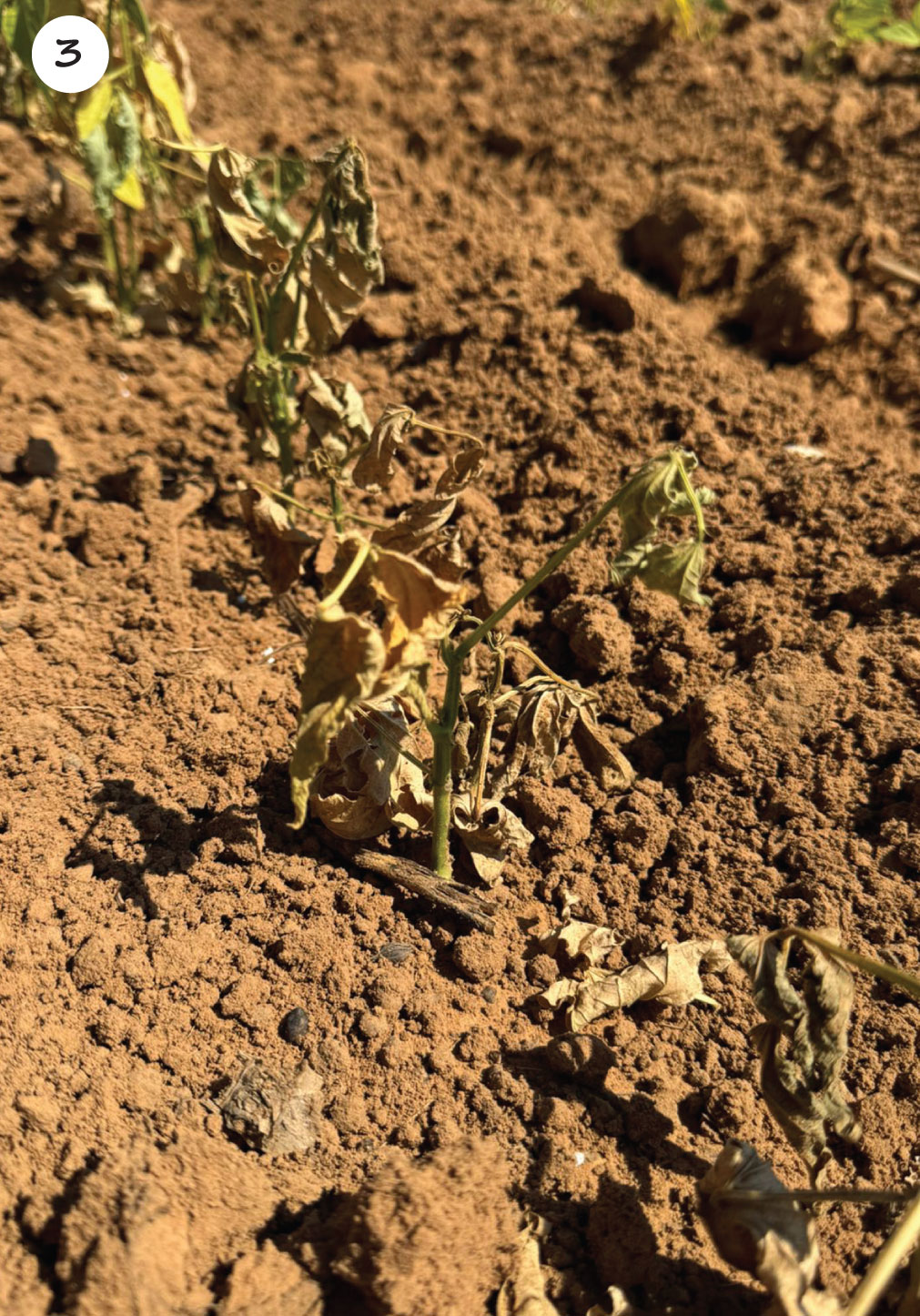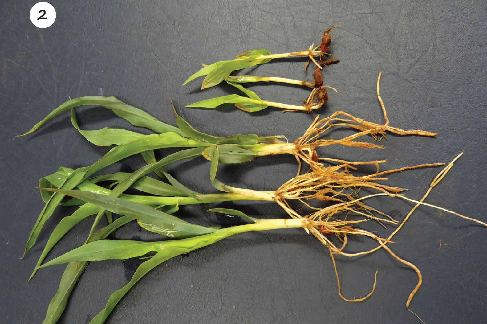 Gebiede wat ’n lae plantestand het weens sade wat nie ontkiem het nie, kan op saailingverwelking dui (Foto 1). Sade wat hier nie ontkiem het nie, sal tekens van verrotting toon en die saailingwortels en -stamme sal verkleur en sag wees. Soms kan swamgroei op die wortels en stamme waargeneem word (Foto 2). As die saailinge wel opkom, is hulle geneig om geel en verwelk te lyk en meer vatbaar vir afsterwing te wees (Foto 3). Die mesokotiel van so ’n saailing sal verkleurde, ingesinkte letsels hê.