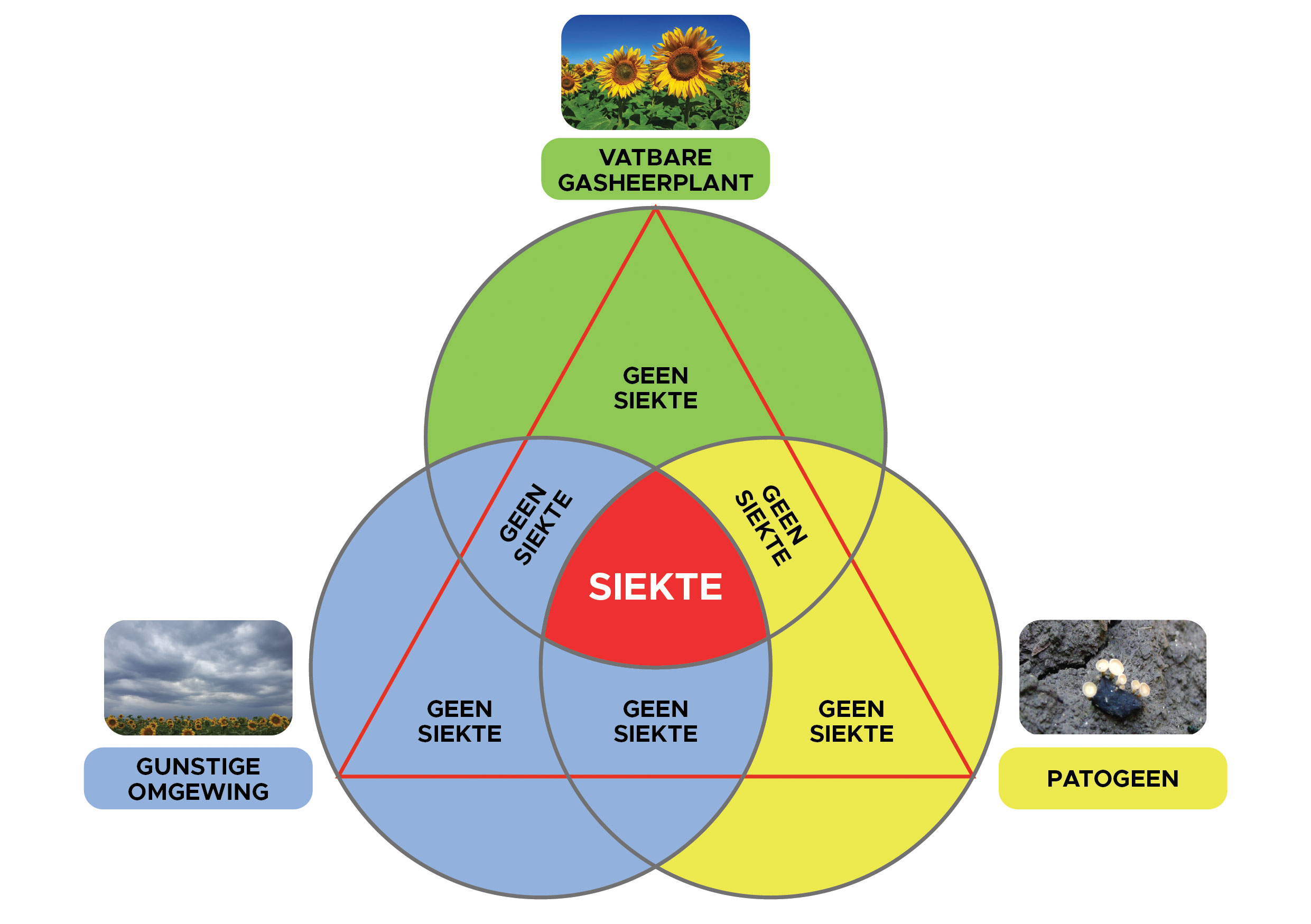 Die voorkoms van plantsiektes is afhanklik van die omgewingstoestande tydens die kritieke groeistadium van ’n betrokke gewas. ’n Siekte kan slegs voorkom wanneer daar oorvleueling is van al die nodige faktore, naamlik ’n vatbare gasheer, patogeen en geskikte omgewingstoestande. Die siektedriehoek illustreer hierdie beginsel die beste (Figuur 1). Soos hierdie drie faktore oor tyd ontwikkel bepaal dit wanneer die infeksie plaasvind, hoe vinnig die siekte vestig en wat die uiteindelike skade sal wees aan die betrokke oes. In die geval van Sclerotinia op sonneblom is die ideale tyd vir infeksie tydens die blomstadium. Temperature van ongeveer 15 tot 25 ˚C en nat grondtoestande van ongeveer 10 tot 14 dae stimuleer die voorkoms van Sclerotinia.