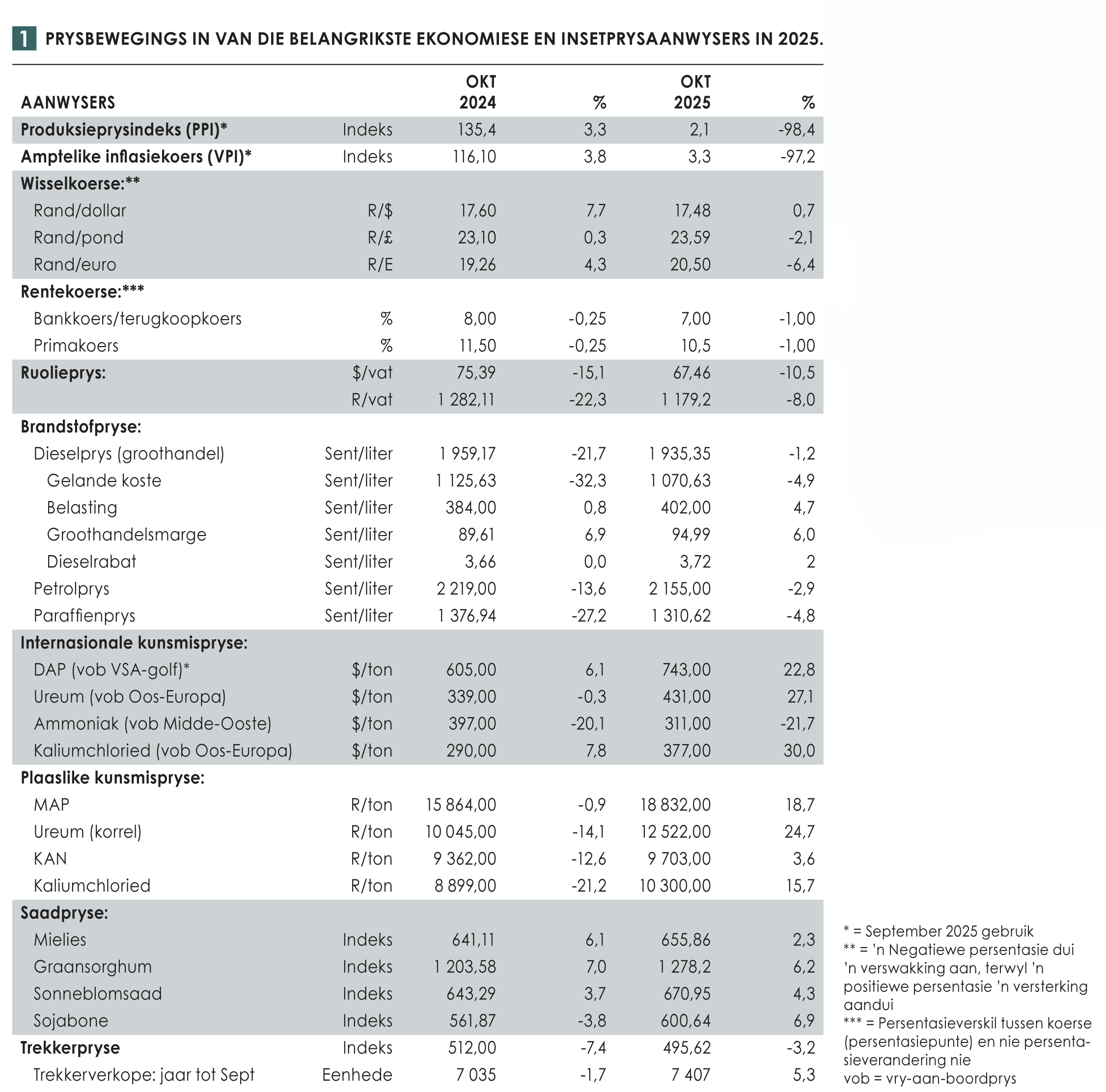 In Tabel 1 word ’n versterking van die waarde van die rand teenoor ander geldeenhede as ’n positiewe verandering aangedui, terwyl ’n verswakking as ’n negatiewe persentasieverandering getoon word. Die rand het met 0,7% teenoor die dollar versterk en met 2,1% teenoor die euro verswak. Die grootste daling is gesien teenoor die pond wat verswak het met 6,4% van Oktober 2024 tot Oktober 2025. Suid-Afrika is baie afhanklik van invoer van insette, daarom het ’n swakker rand bygedra tot hoër insetpryse.