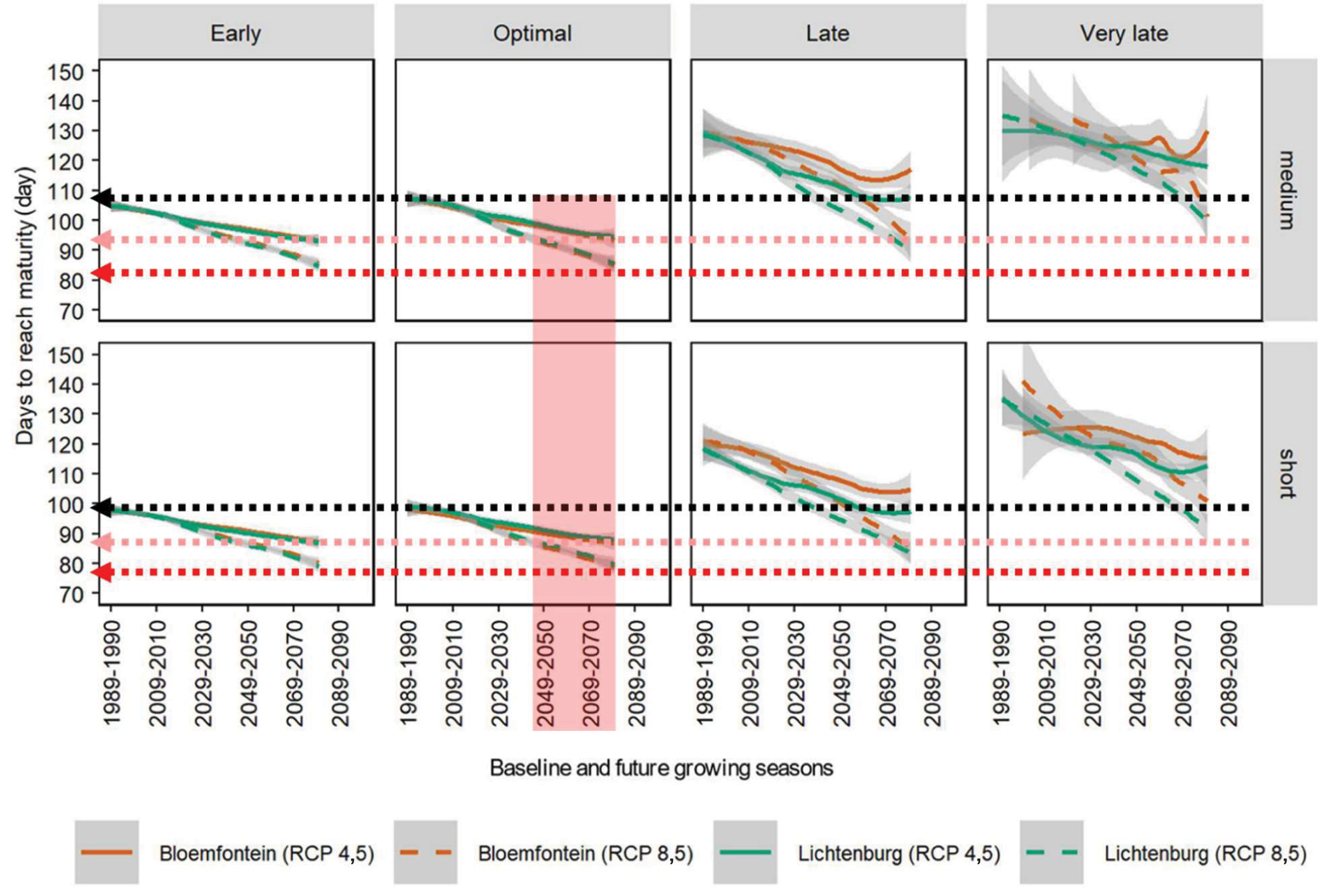 Study 2: Based on the weather shifts observed in Study 1, the changes can be extrapolated into the future based on current climate change models (RCP 4,5 and RCP 8,5). These new climates are then assessed against maize growth based on what we know about the conditions required for good crop production and how deviations in these conditions will impact maize development. One of the big changes we observed was that at the optimal (15 December) planting date the number of days to maturity will decrease by about ten days for both the short and medium varieties by 2070 for RCP 4,5 and up to 20 days for RCP 8,5 (Figure 2 red and pink arrows).