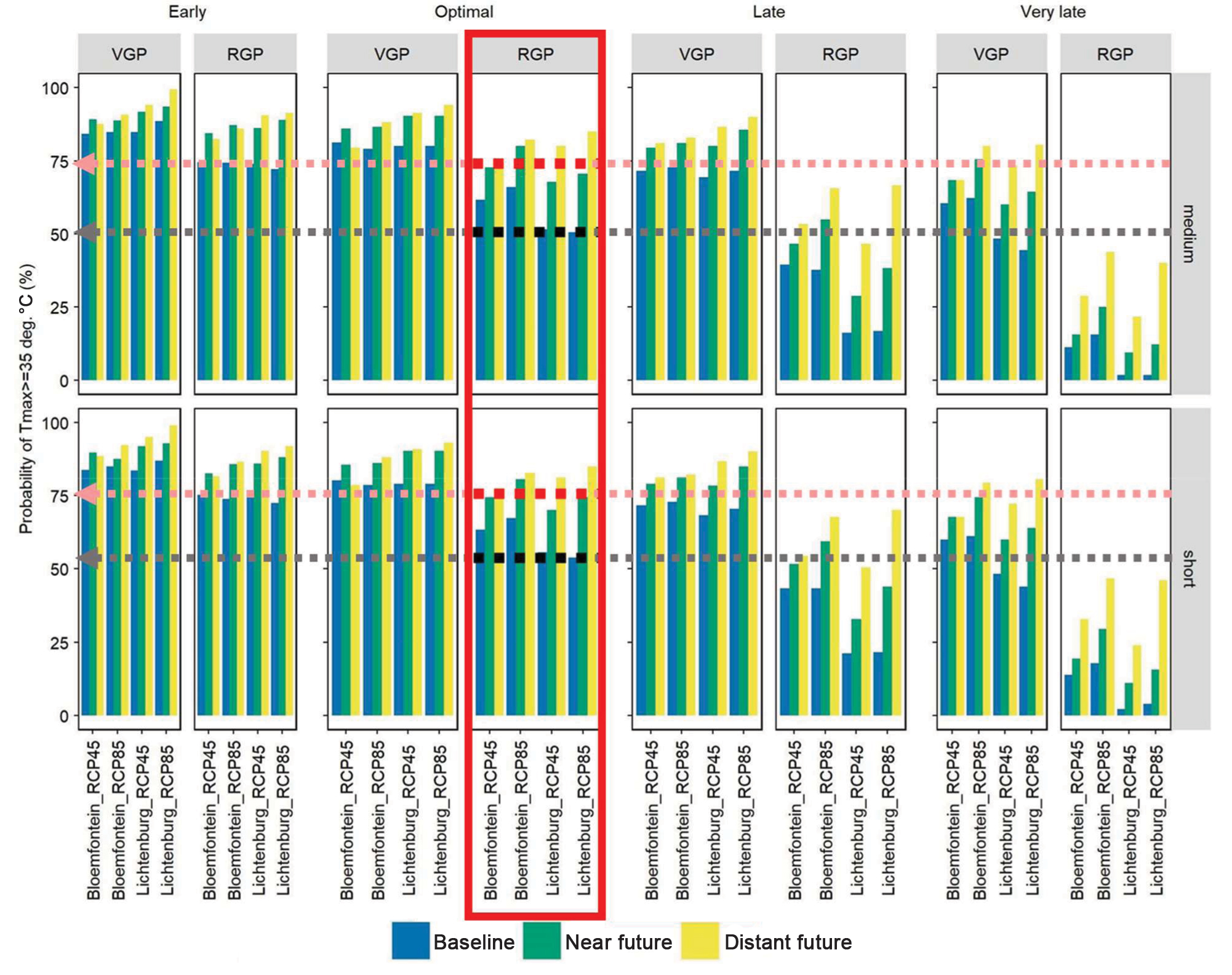 An assessment of how the number of days above 35 °C will change as climate change progresses in the future indicated a steady increase over time. This means more heat waves are likely in Bloemfontein and Lichtenburg in the future (Figure 3). We investigated when in a crop’s development would these ‘potential heat wave days’ be more likely and found that for the optimal planting date in the near and distant future (2050 to 2100) the reproductive growth phase (RGP) of both short- and medium-maturing varieties would be more exposed to high-heat days. This is a concerning finding since maize flowering and pollination are known to be negatively affected by high temperatures and it suggests that in the future the current optimal planting date may limit yields due to heat stress during silking and tasselling. The late January planting date had fewer exposures to high-heat days in the future. This again suggests planting dates must be monitored to ensure crop development is aligned with the best climate as we move into the future.