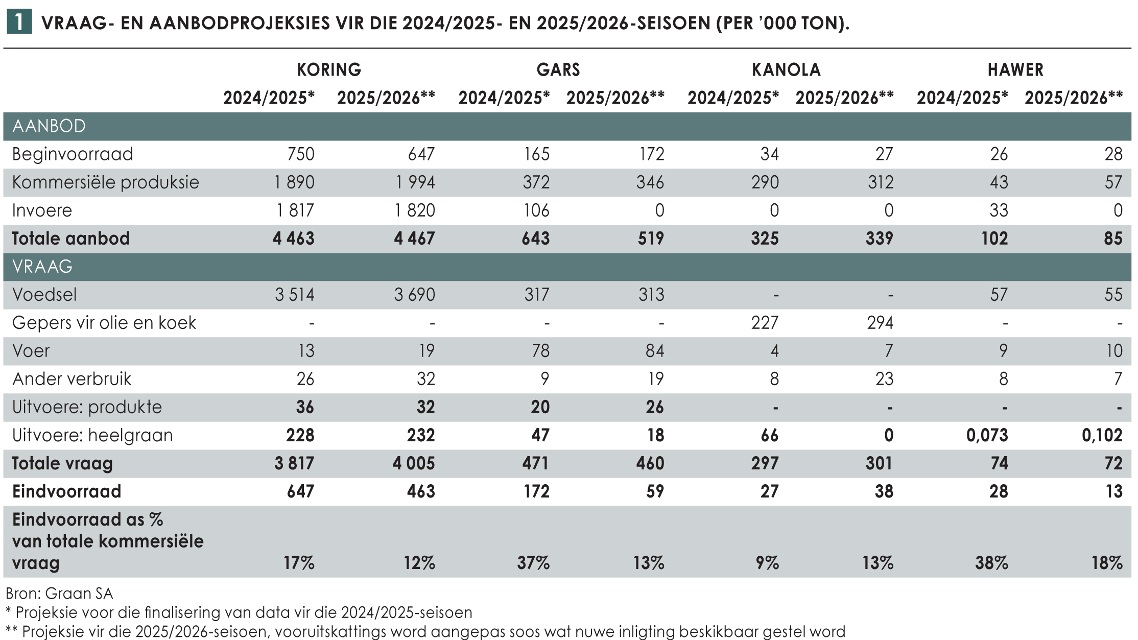 Teen Oktober 2025 het Suid-Afrika se wintergraanbedryf die eerste bemarkingsmaand van die 2025/2026-seisoen betree. Hoewel dit nog vroeg is, bied beskikbare markinligting reeds ’n eerste aanduiding van verwagte vraag- en aanbodneigings wat uiteindelik plaaslike prysbewegings bepaal (Tabel 1).
