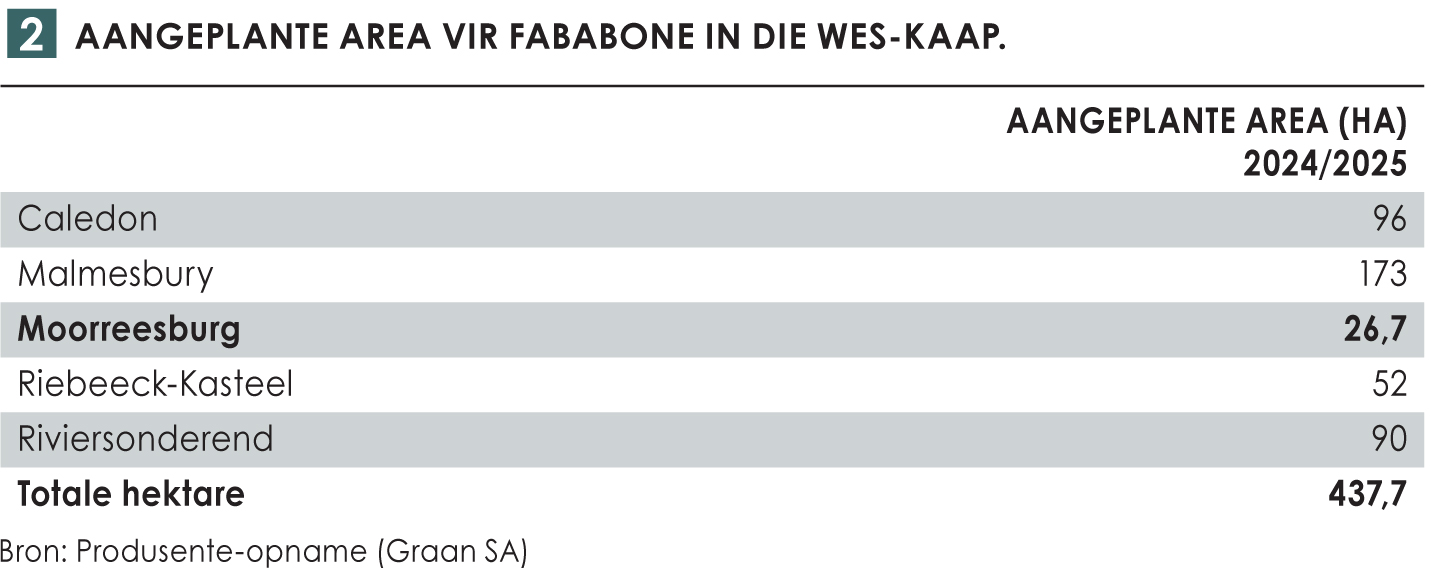 In die 2024/2025-seisoen het die produksie van fababone as ’n fokuspunt opgekom in Graan SA se produsentewerkgroep vir lupiene en alternatiewe gewasse. Volgens ’n produsente-opname in 2025 is daar ongeveer 438 ha fababone in die Wes-Kaap aangeplant. Die verspreiding van aanplanting kan in Tabel 2 gesien word. Die groter mark vir hierdie gewas moet verder ontwikkel word om produksie te stabiliseer. Graan SA ondersoek tans markte vir hierdie gewas.