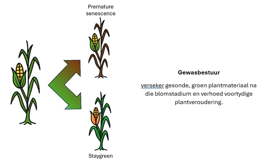 Selfs al is die genetiese staygreen-eienskap nie noodwendig altyd duidelik in ’n baster nie, kan boere dit steeds met goeie bestuurspraktyke bewerkstellig. Só ’n bestuursbenadering beteken dat plantstremming bestuur moet word deur optimale bemesting, die regte plantestand asook doeltreffende siektebeheer om vroeë veroudering teë te werk. Hierdie bestuurspraktyke sal help dat optimale fotosintese tydens die reproduktiewe stadiums van plantontwikkeling sal voortduur.