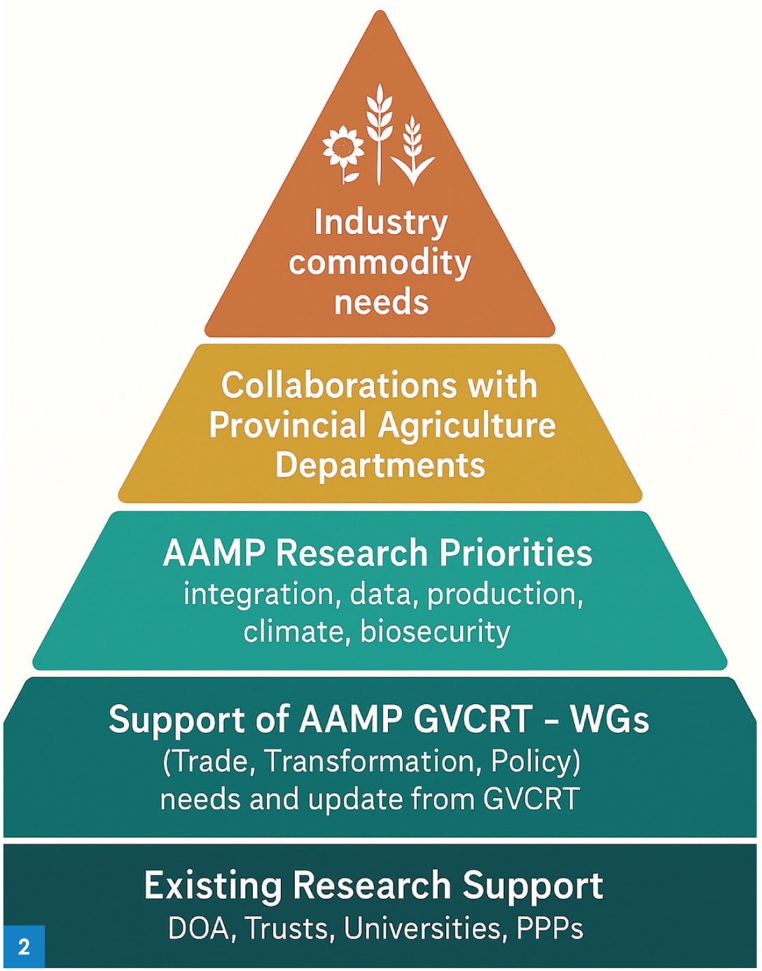 The second tier focuses on supporting the AAMP GVCRT working groups Trade, Transformation, and Policy by identifying where research and technology can offer practical solutions to the issues these groups encounter. The third tier aligns with the AAMP’s overarching research priorities including value chain integration, data and digital systems, production efficiency, climate resilience, and biosecurity, ensuring that the research agenda remains strategic and responsive to both national and global shifts.