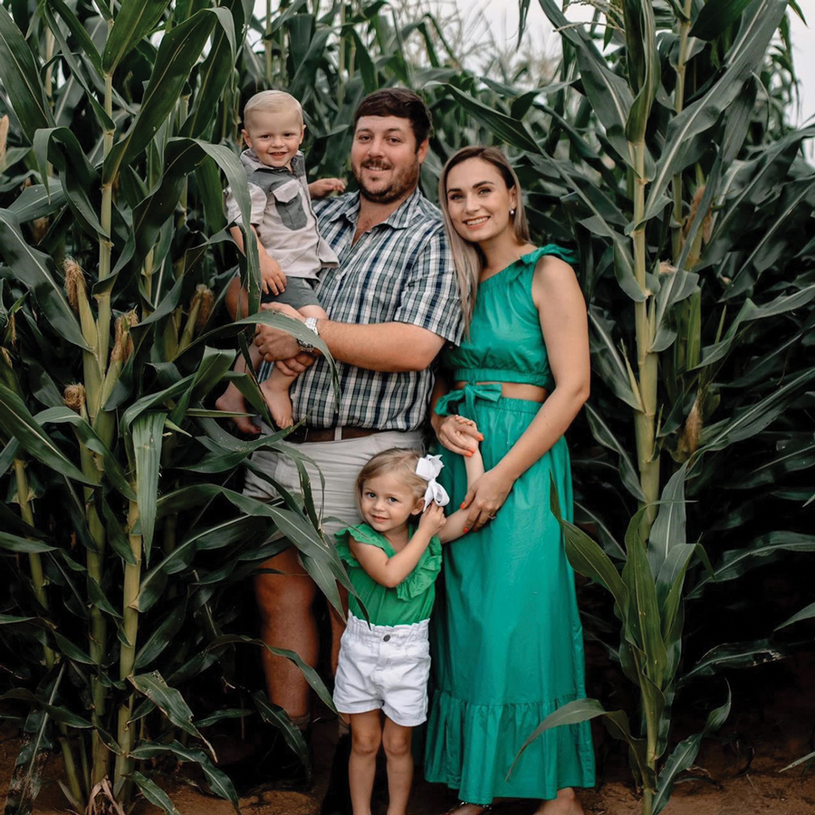 Die Botma-gesin staan trots tussen die DEKALB-mielies waarmee Jan vanjaar ’n nuwe opbrengsrekord opgestel het. Van links is klein Gerhard, Jan en Erica Botma met Janke voor.