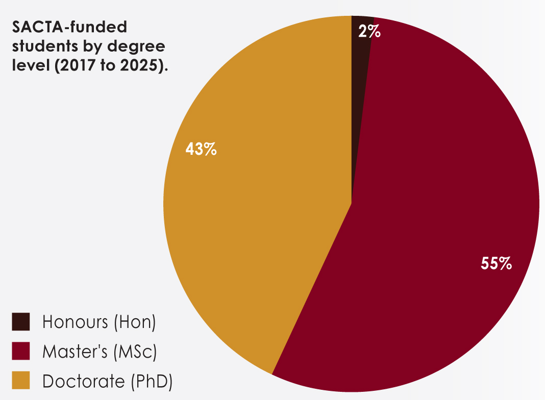 Over the years, numerous students across South Africa have been funded through the SACTA bursary programme, with a wide range of research focuses. About 42 students have been funded since 2017, which has produced 18 doctorates and 23 master’s degrees. Upon graduation, these students play a pivotal role in advancing the agricultural sector, contributing their knowledge and expertise to drive growth and innovation.
